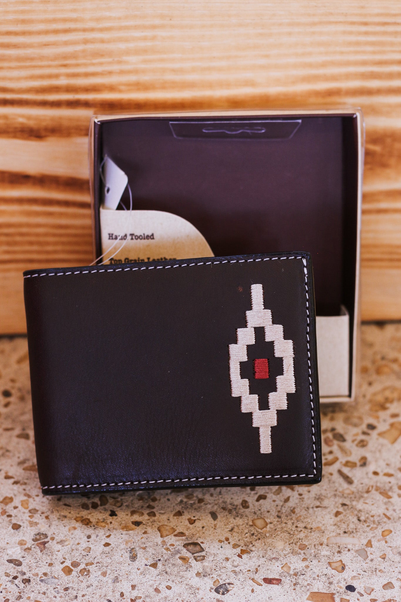 Decorative and stylish men’s 3D bifold wallet. It is made of genuine leather with a tan and maroon southwest pattern that is laced on the front. Multiple card slots and ID window.