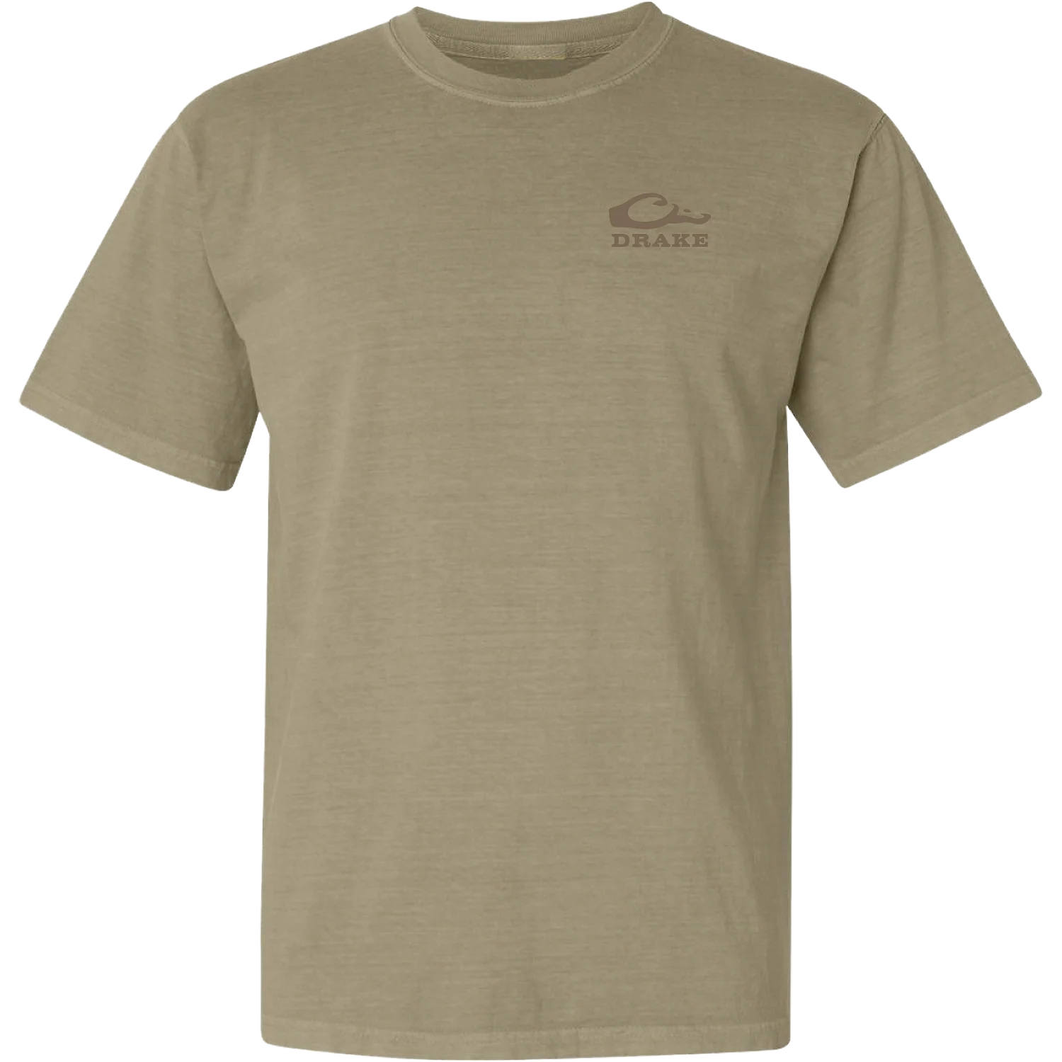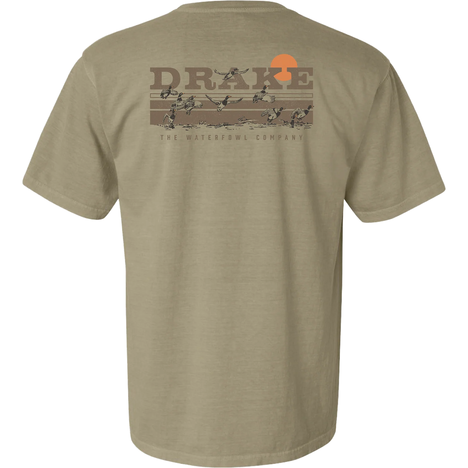 The Drake Waterfowl Cotton Graphic Tee is constructed with 100% Cotton for a soft, comfortable hand feel. The Drake Take Flight is non-pocketed, has a Drake logo on the front left chest, and depicts a Mallard flight scene watercolor graphic. From our Drake Cotton Series of back graphic tees.