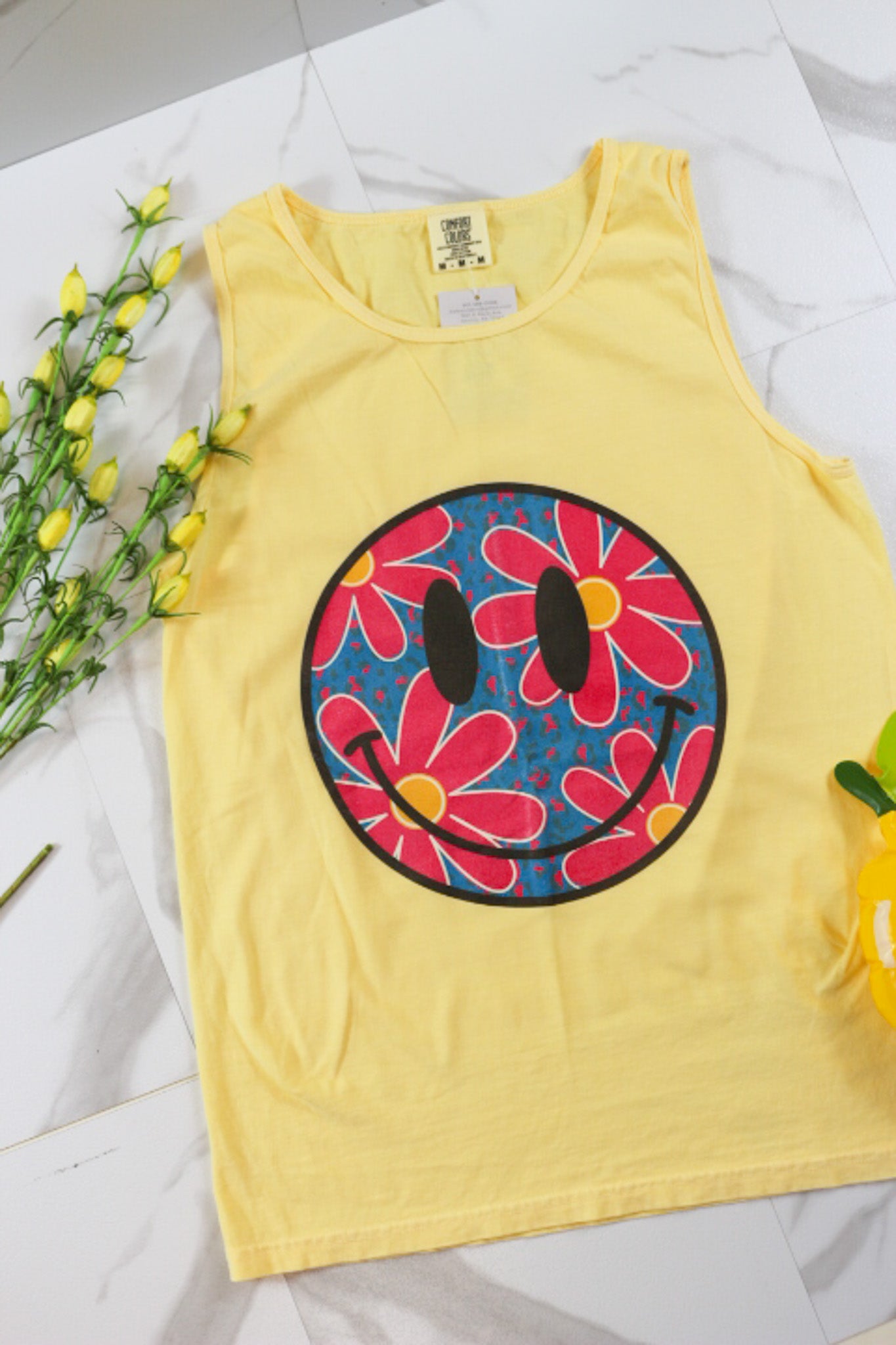 Brighten your day with the Floral Smiley Yellow Graphic Tank! This cheerful tank features a fun smiley face surrounded by vibrant floral designs, perfect for adding a splash of sunshine to any outfit. Lightweight and comfy, it’s ideal for warm days and playful vibes. Let your style bloom with this happy, eye-catching piece!