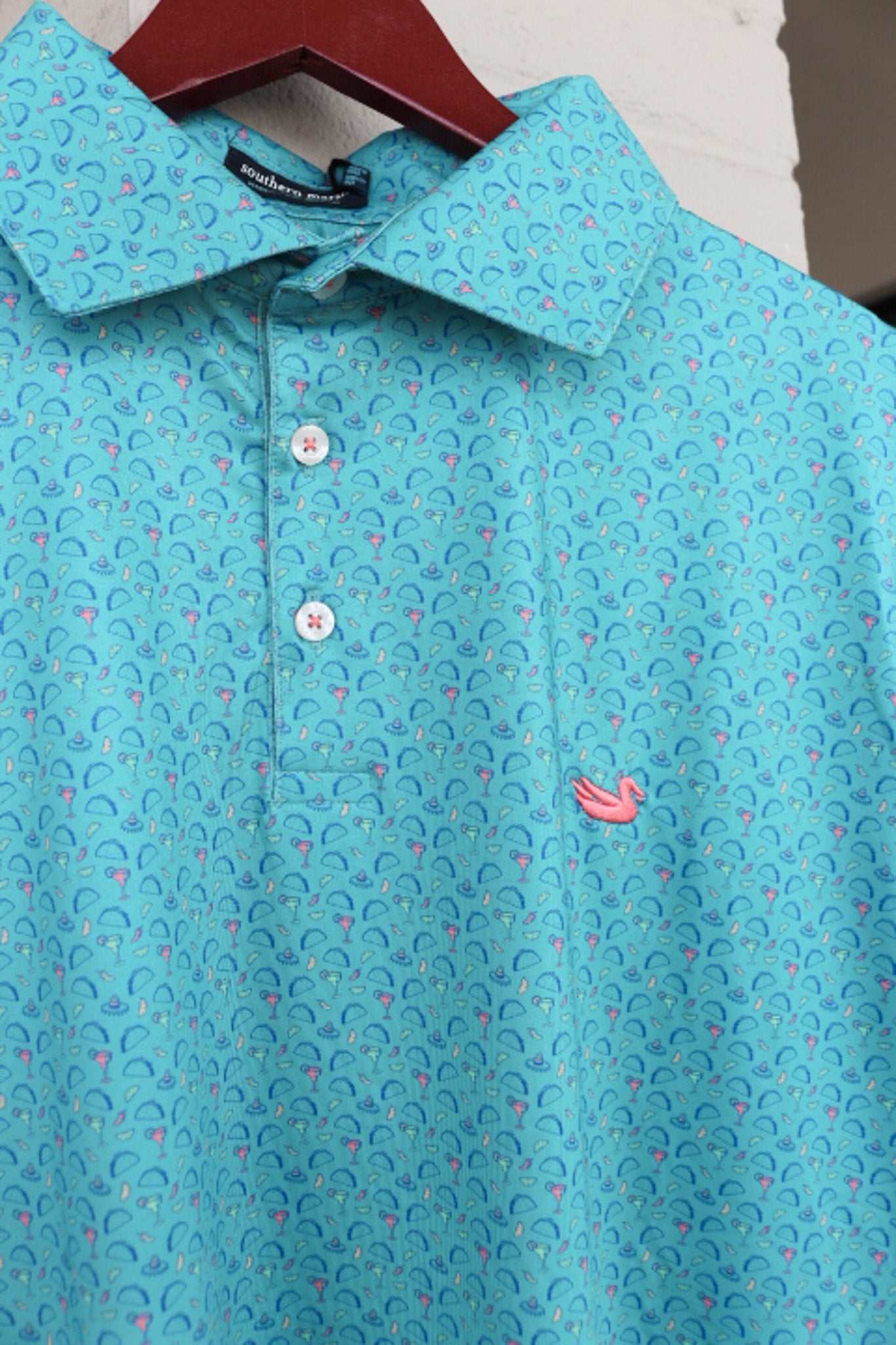 Celebrate Taco Tuesday in style with the Flyline Performance Polo - Ole Tuesday. Featuring a playful micro print of tacos, margaritas, limes, and jalapeños, this lightweight, moisture-wicking polo keeps you cool and comfortable. Perfect for the golf course, casual outings, or even the office, it offers 4-way stretch and a classic three-button placket. Finished with our signature duck logo on the chest, this polo brings a fun, festive vibe to your spring and summer wardrobe.