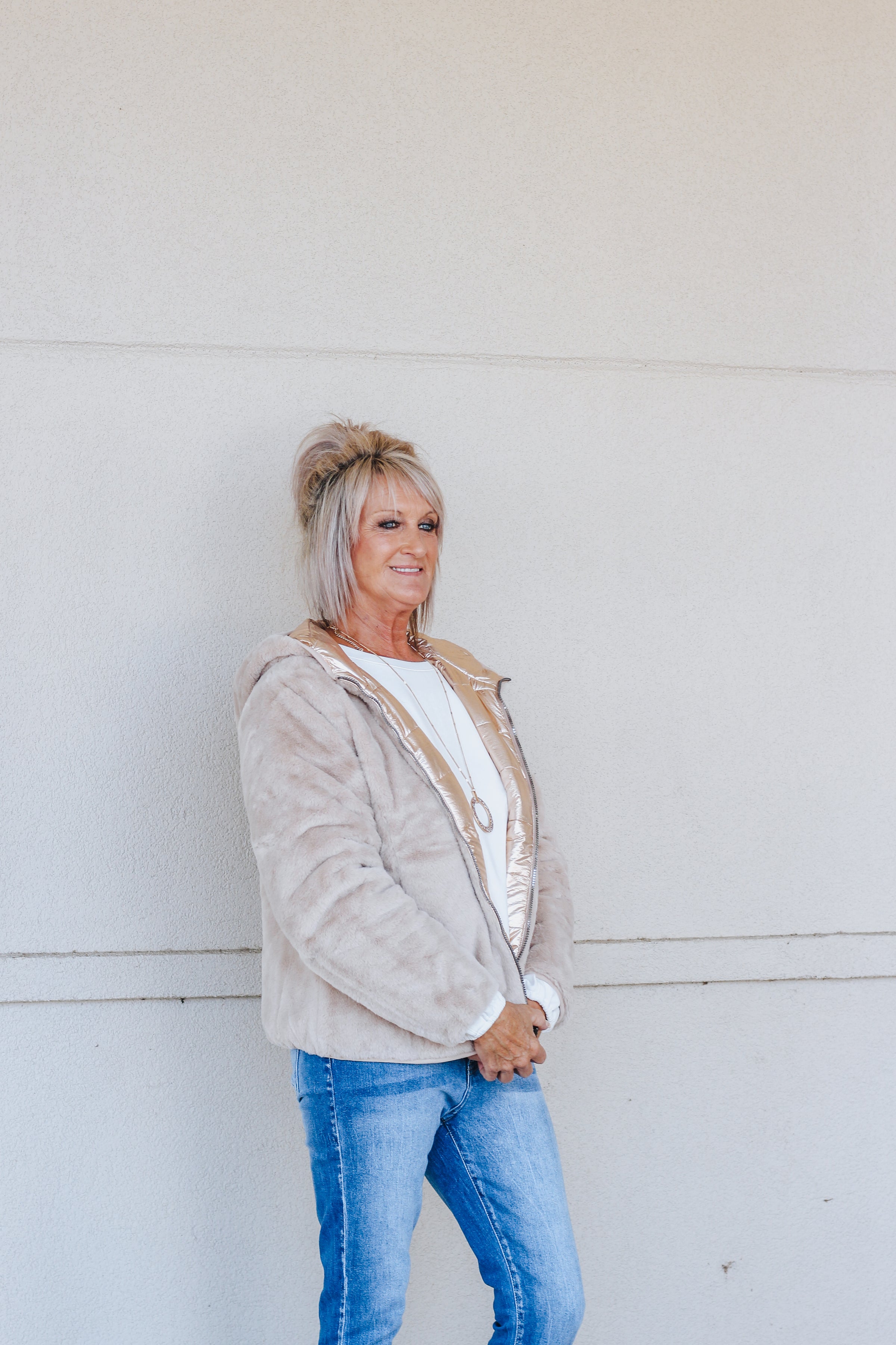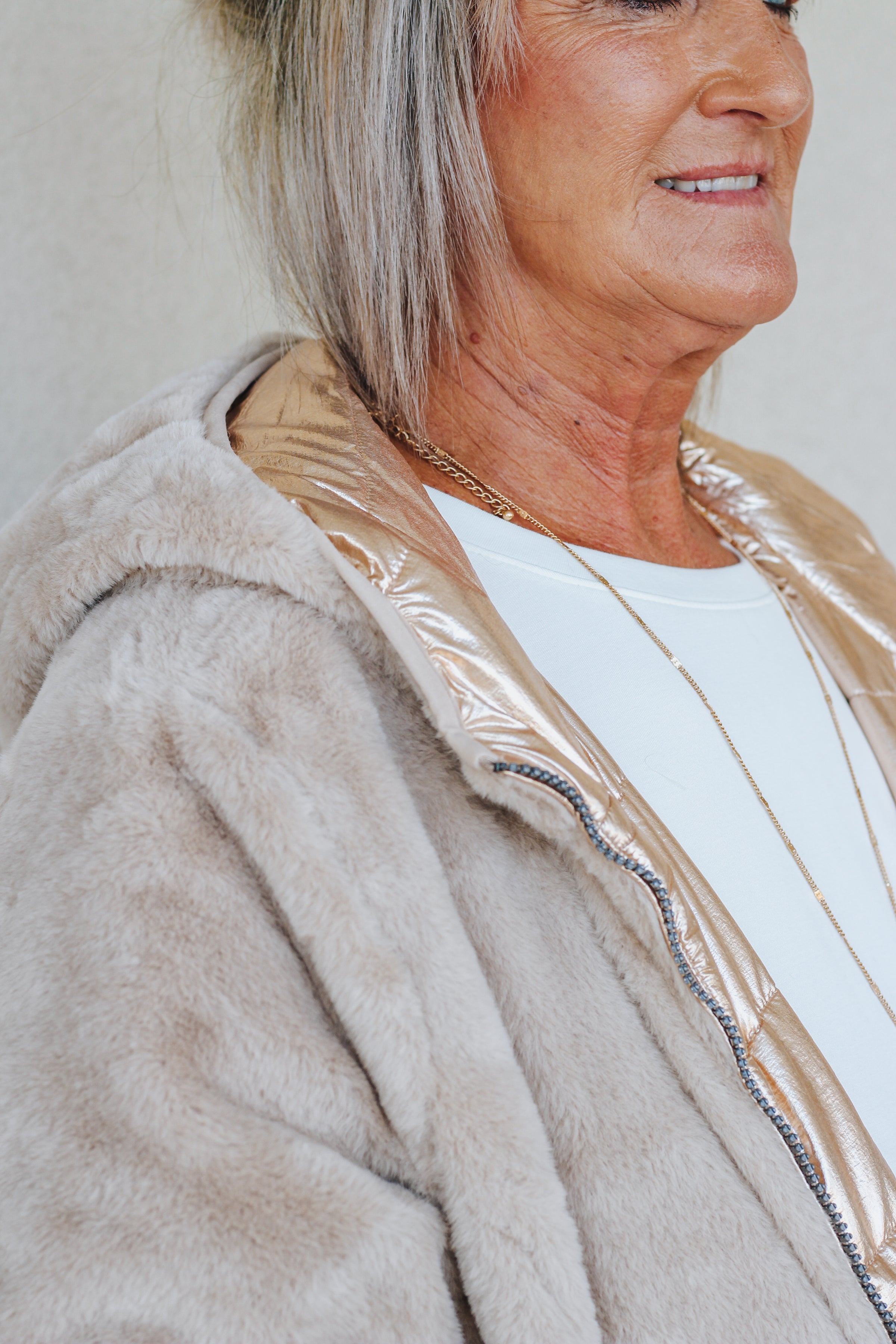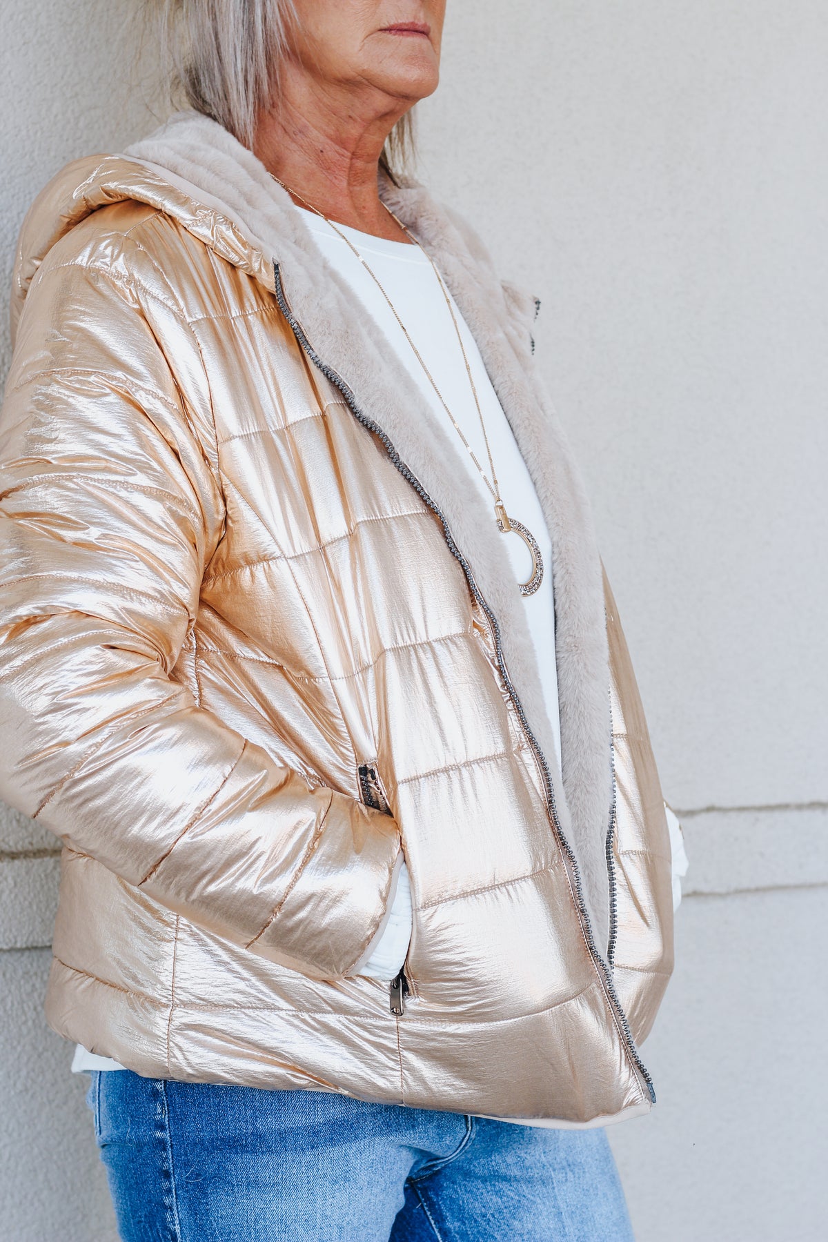 One side is a shiny champagne color and the other is a furry grey material. Has a hood and pockets! Great for winter because it's so thick and cozy!