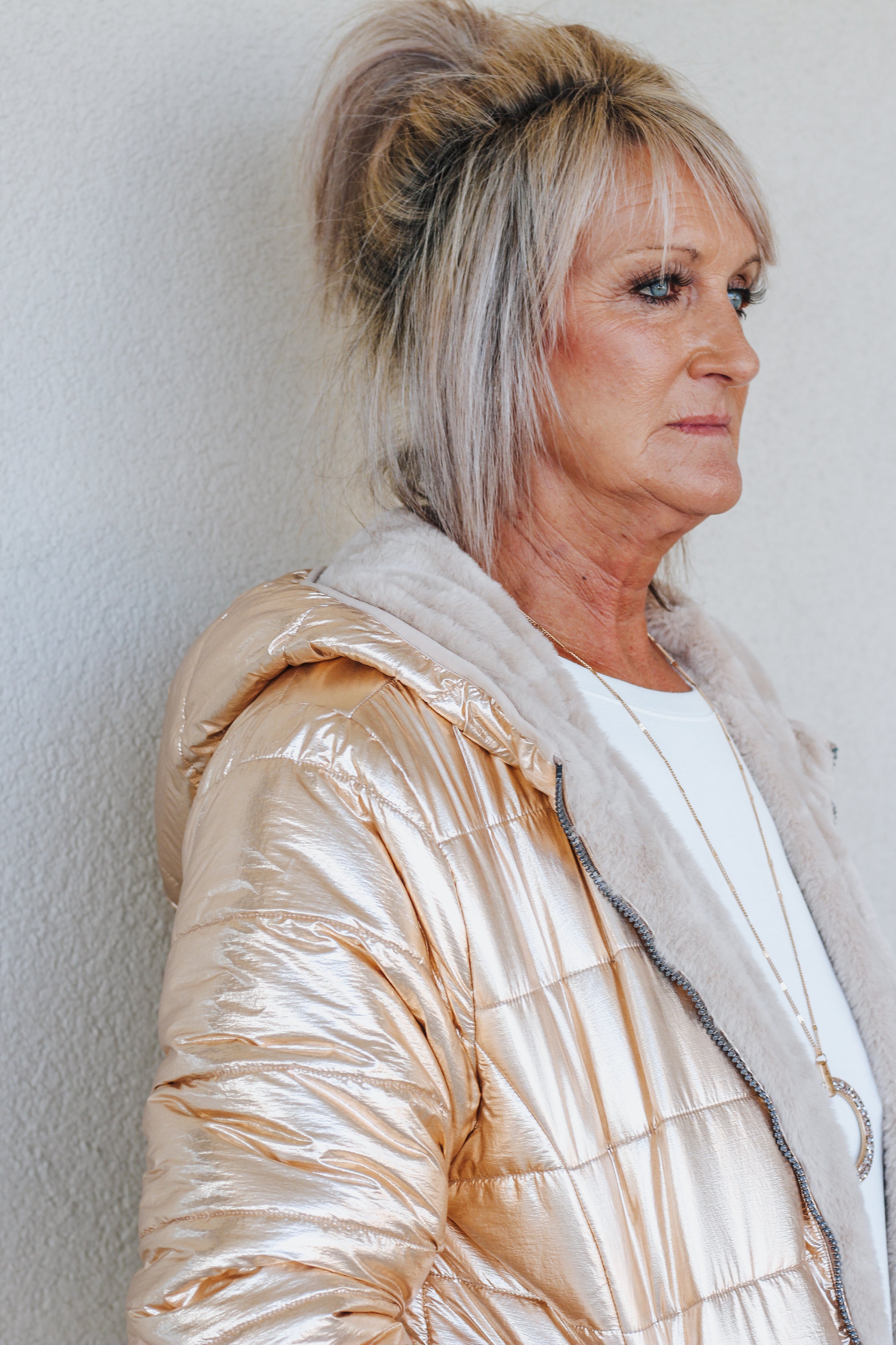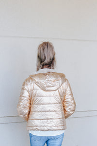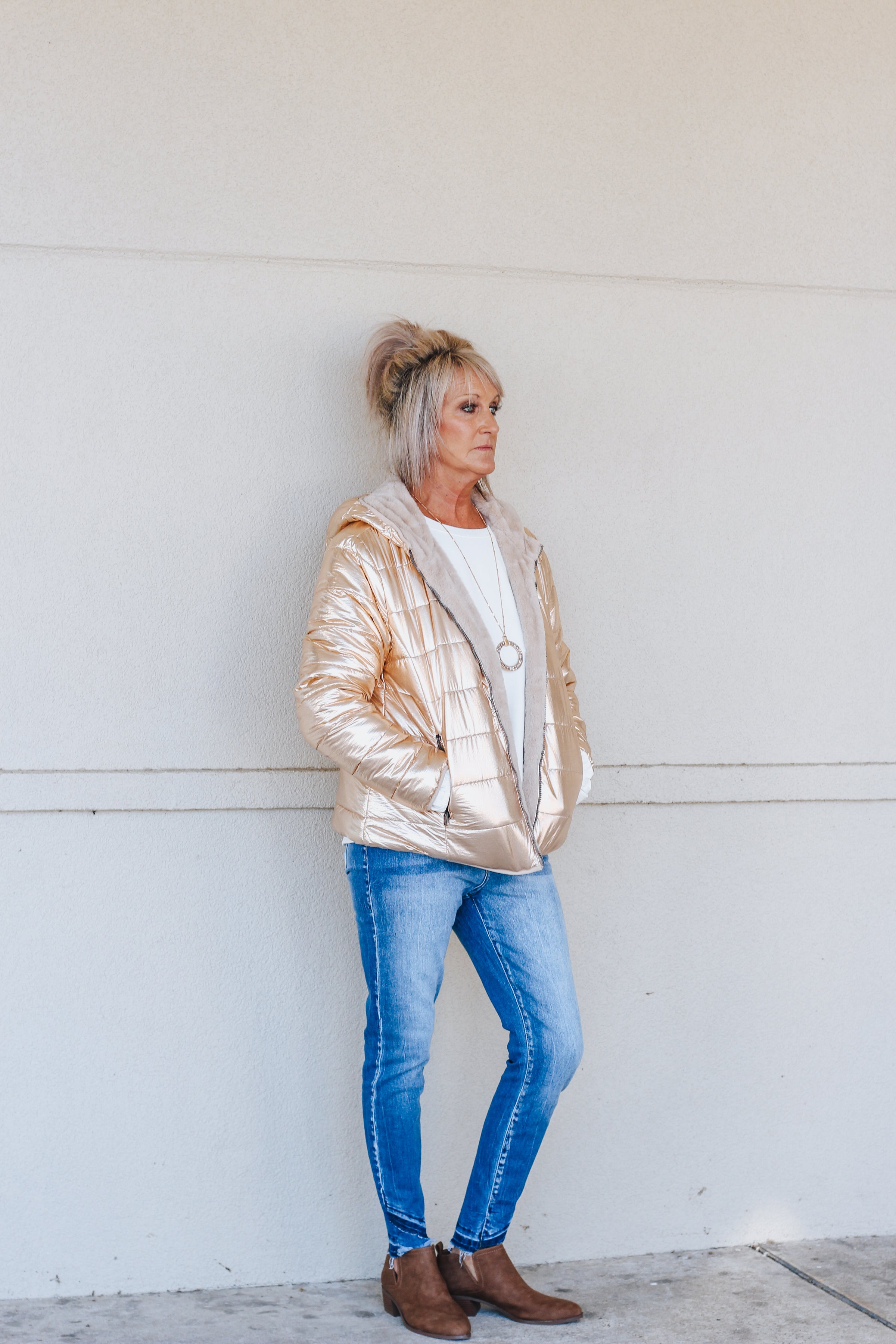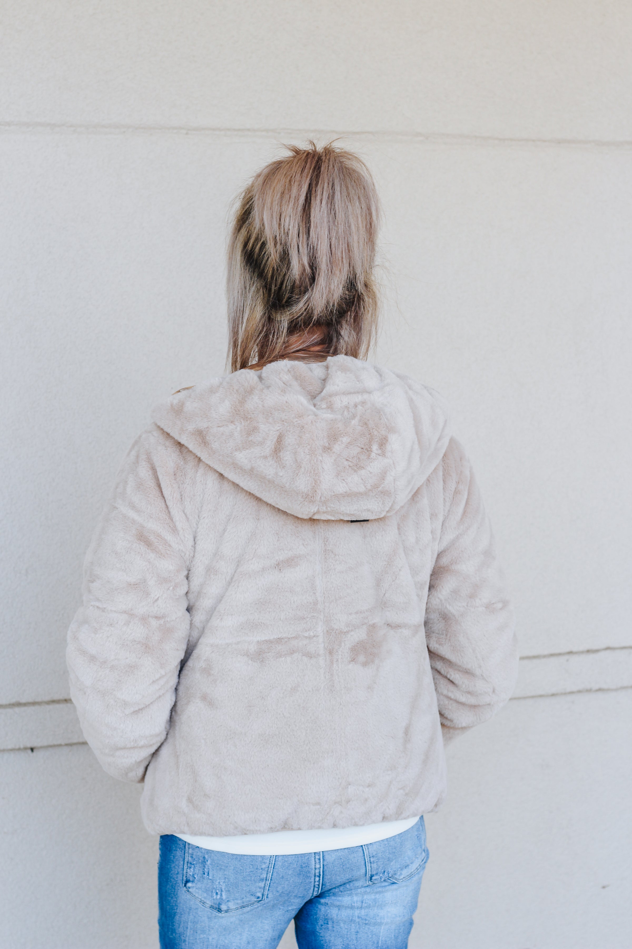 One side is a shiny champagne color and the other is a furry grey material. Has a hood and pockets! Great for winter because it's so thick and cozy!
