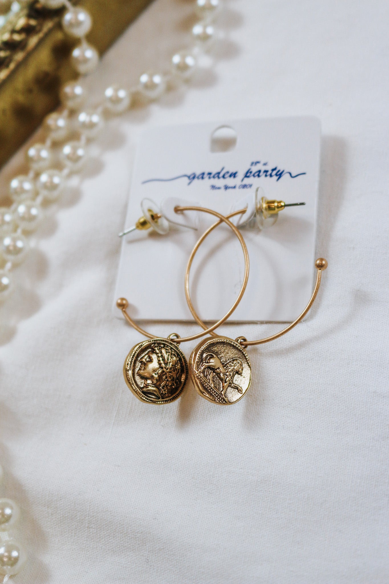 Gold 2" Hoop with Stamped Coin Charm Earring