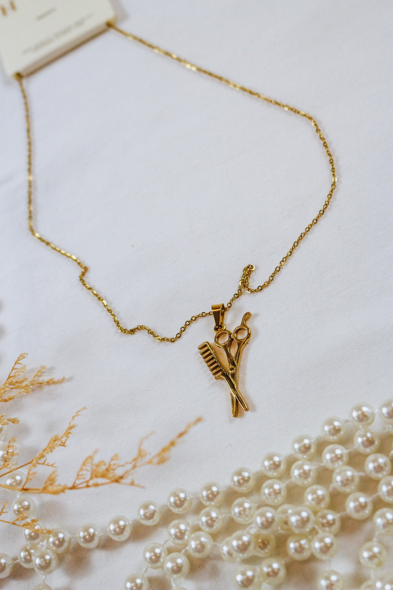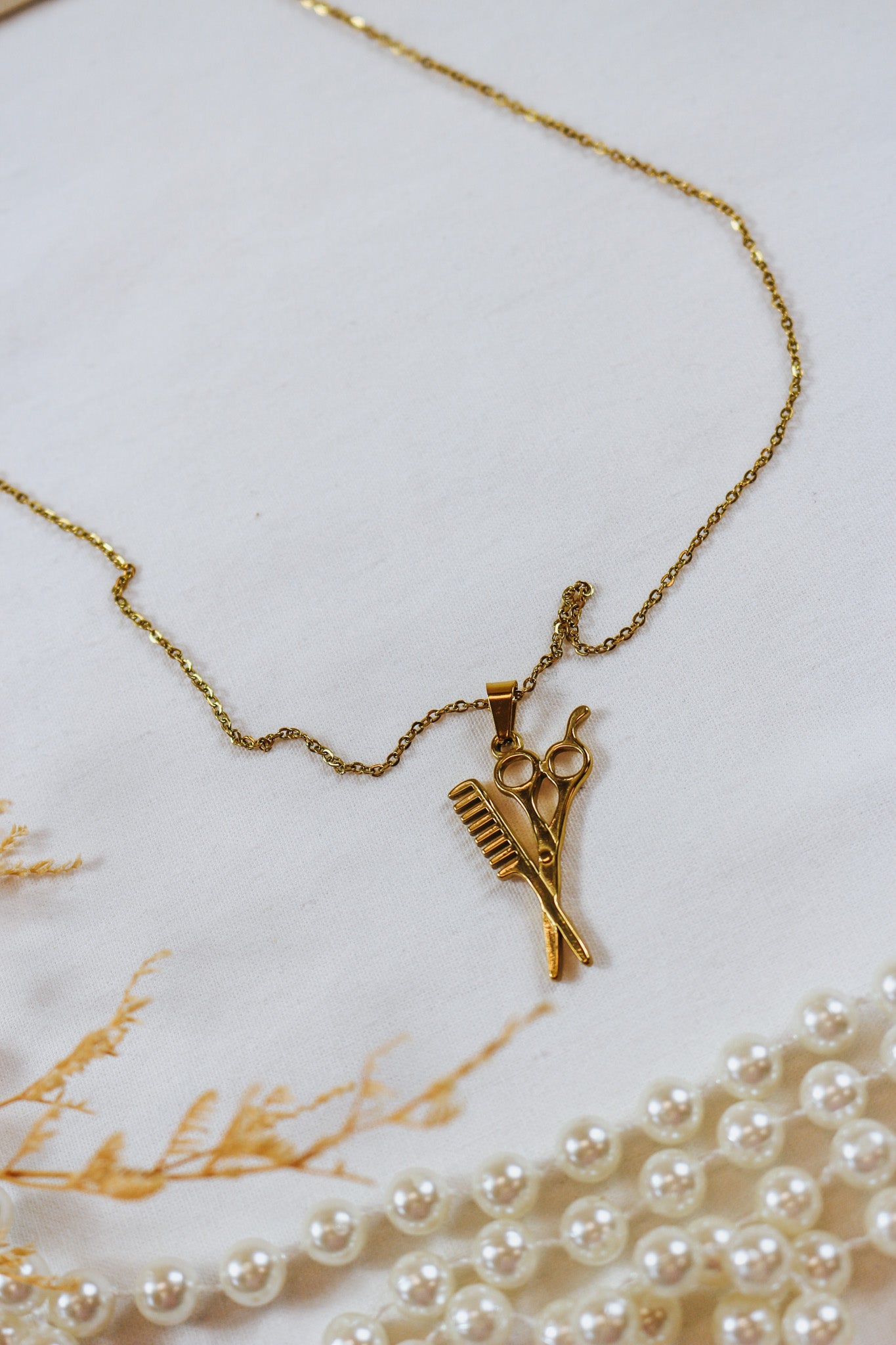 A gold-tone necklace featuring a pendant with a comb and scissors.