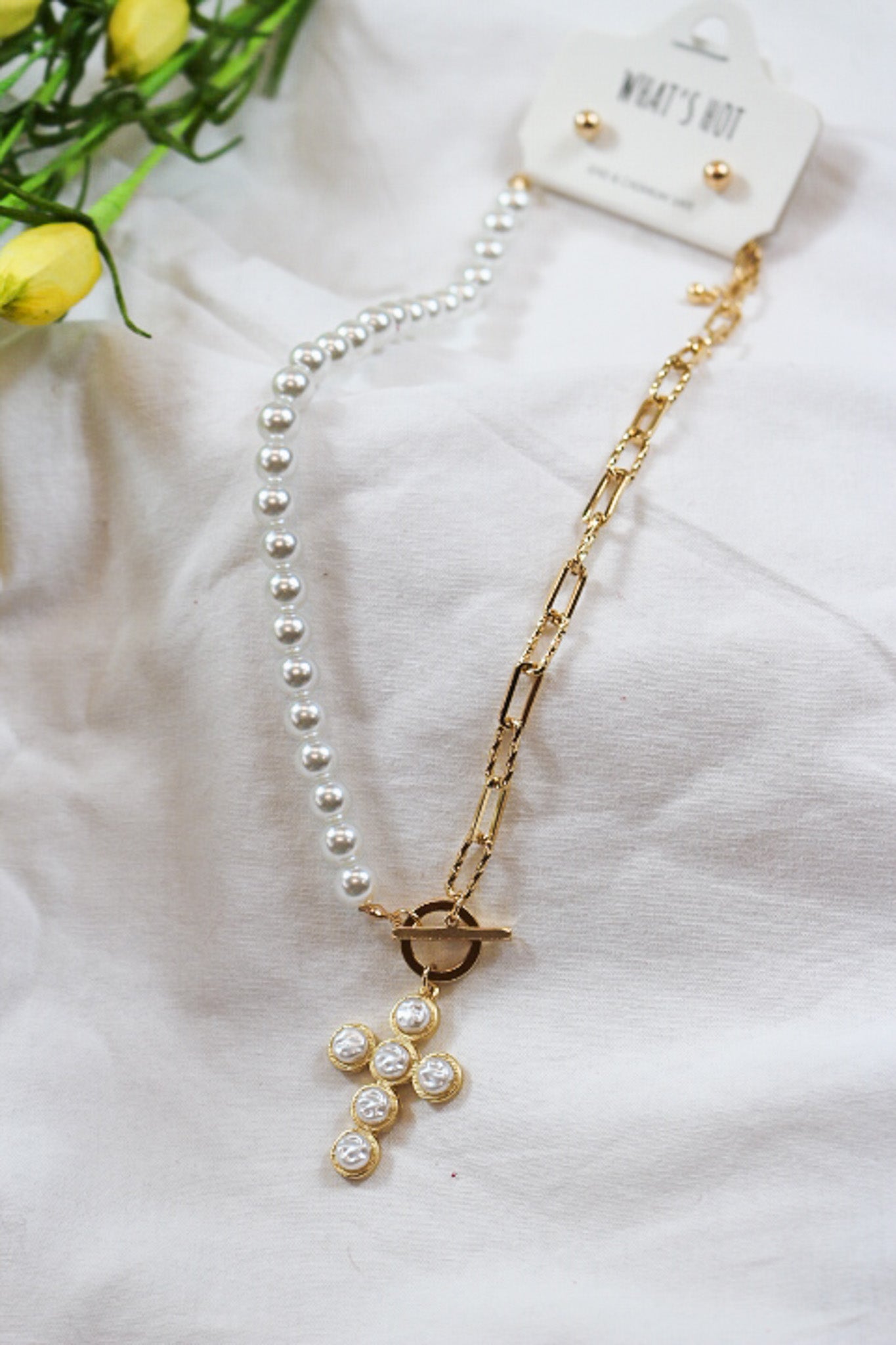 Elevate your style with this Gold Pearl Chain Cross Charm Necklace, adjustable from 16" to 18" for the perfect fit. The delicate gold chain paired with lustrous pearls and a timeless cross charm creates a sophisticated accessory that complements any outfit. Ideal for daily wear or special occasions, this necklace adds a touch of elegance and meaningful symbolism to your jewelry collection.
