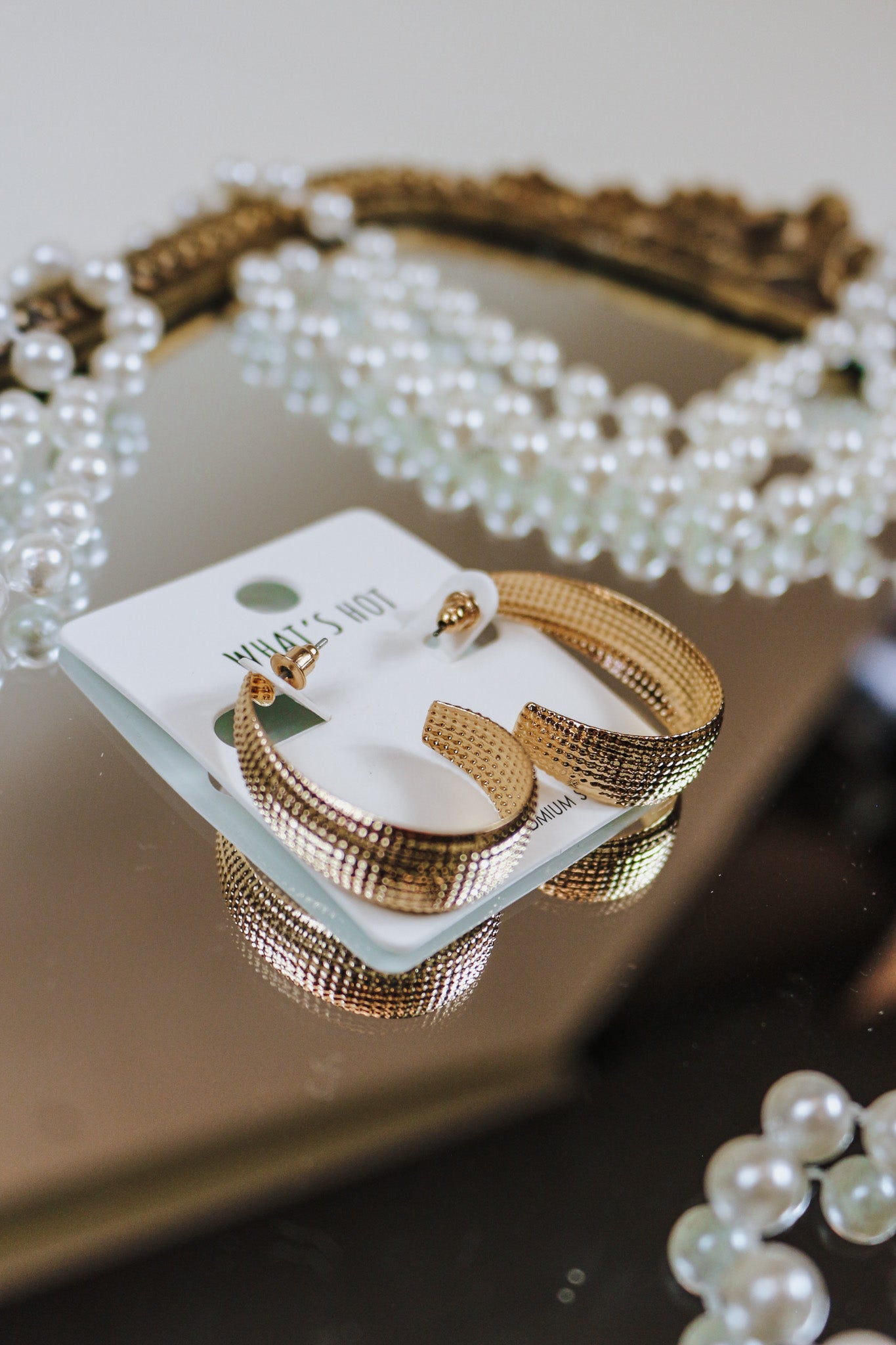 Enhance your style with our Gold Textured Hoop Earrings! Made with high-quality gold, these earrings add a touch of elegance and sophistication to any outfit. The textured design adds a unique and eye-catching element, making them a must-have accessory for any fashion-forward individual. Elevate your look with these beautiful earrings.