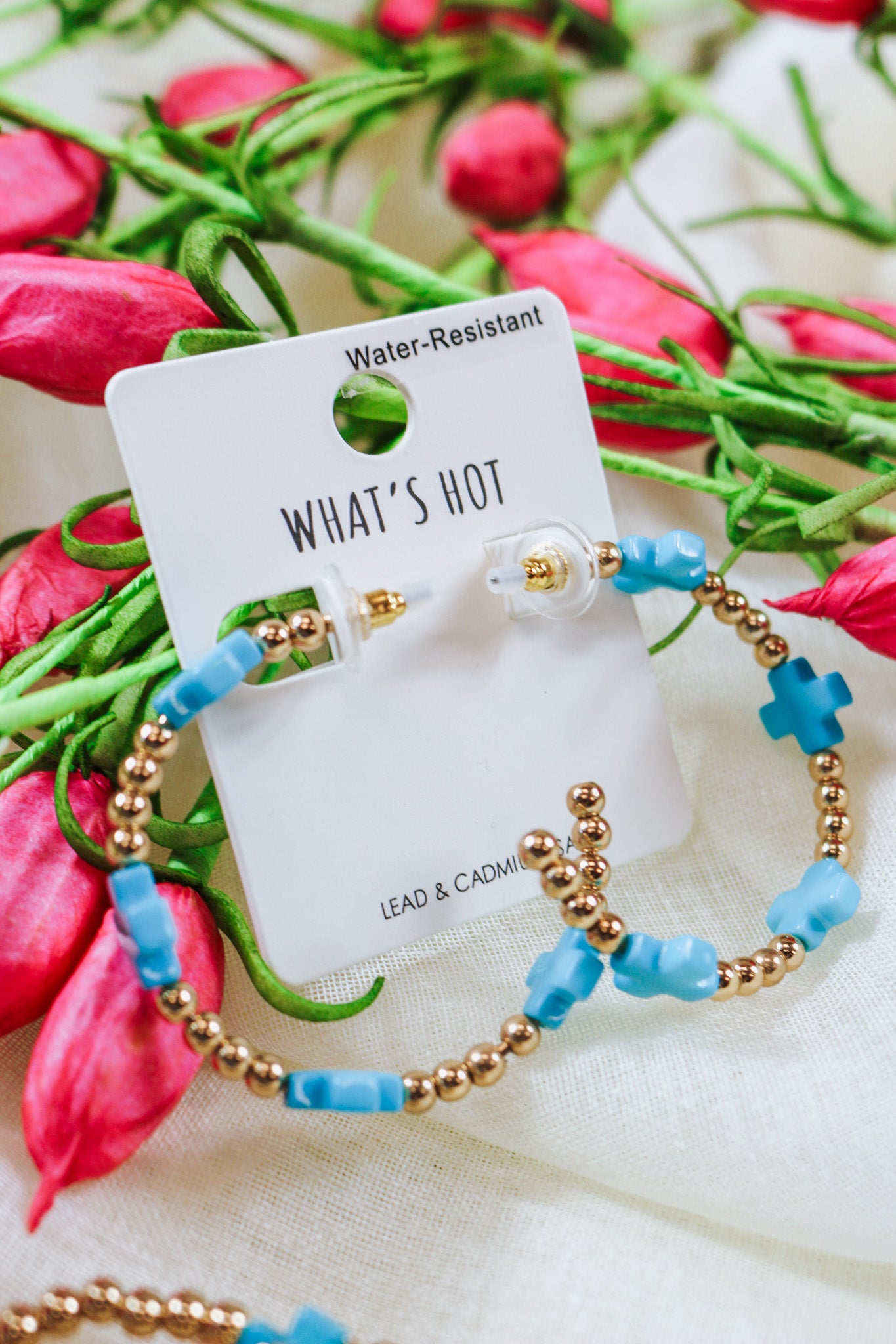 Elevate your jewelry game with our Gold Turquoise Cross Beaded Hoop Earrings! These stylish hoops feature stunning gold and turquoise beads arranged in a delicate cross design. Add a touch of bohemian flair to any outfit and make a bold statement with these unique earrings.