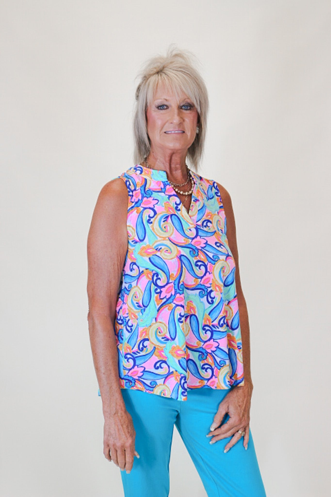 The Lizzy Sleeveless Top combines practicality with style. Its wrinkle-free design ensures a polished and professional look, perfect for business attire. Featuring a stunning paisley pattern in a vibrant multi-colored colorway, this flowy top offers a comfortable and fashionable option for any occasion.