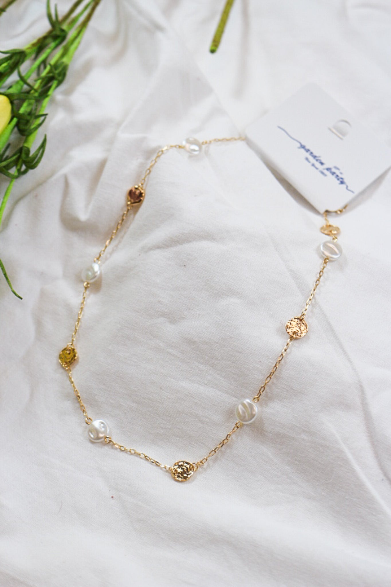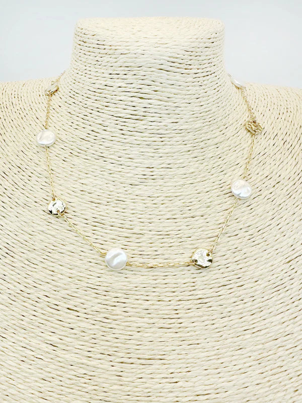 Hammered Gold Coin and Pearl 16"-18" Necklace