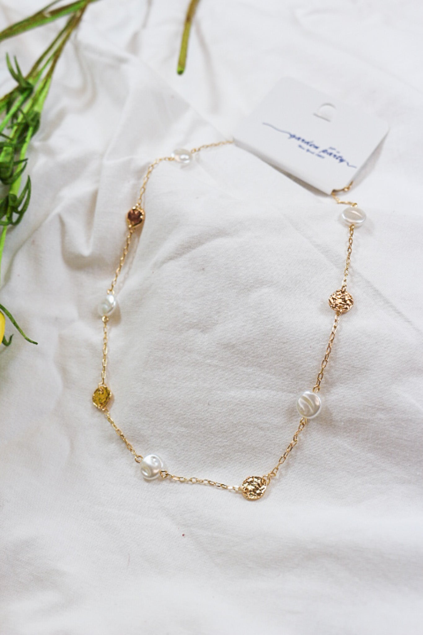 Elevate your style with this Hammered Gold Coin and Pearl Necklace, adjustable from 16" to 18" for the perfect fit. The unique hammered gold coin adds a touch of vintage charm, while the lustrous pearls bring timeless elegance. This versatile piece effortlessly complements both casual and formal looks, making it a must-have accessory that enhances your wardrobe with subtle sophistication.