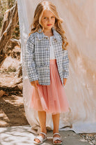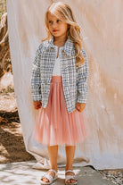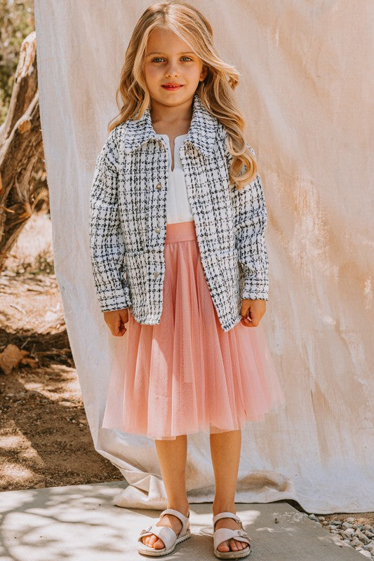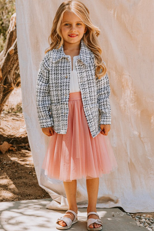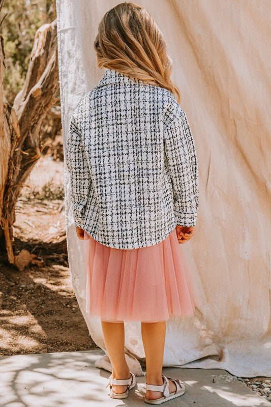 Frayed edge detailed tweed jacket featuring front snap closure, and side pockets.