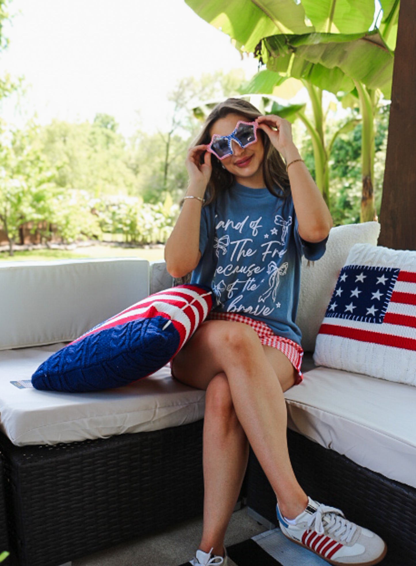 Show your patriotic pride with our "Land of the Free Because of the Brave" graphic t-shirt. This comfortable tee is adorned with charming coquette bows and bold stars graphics, making it a perfect addition to any wardrobe. Made from durable materials, it's perfect for everyday wear or special occasions.