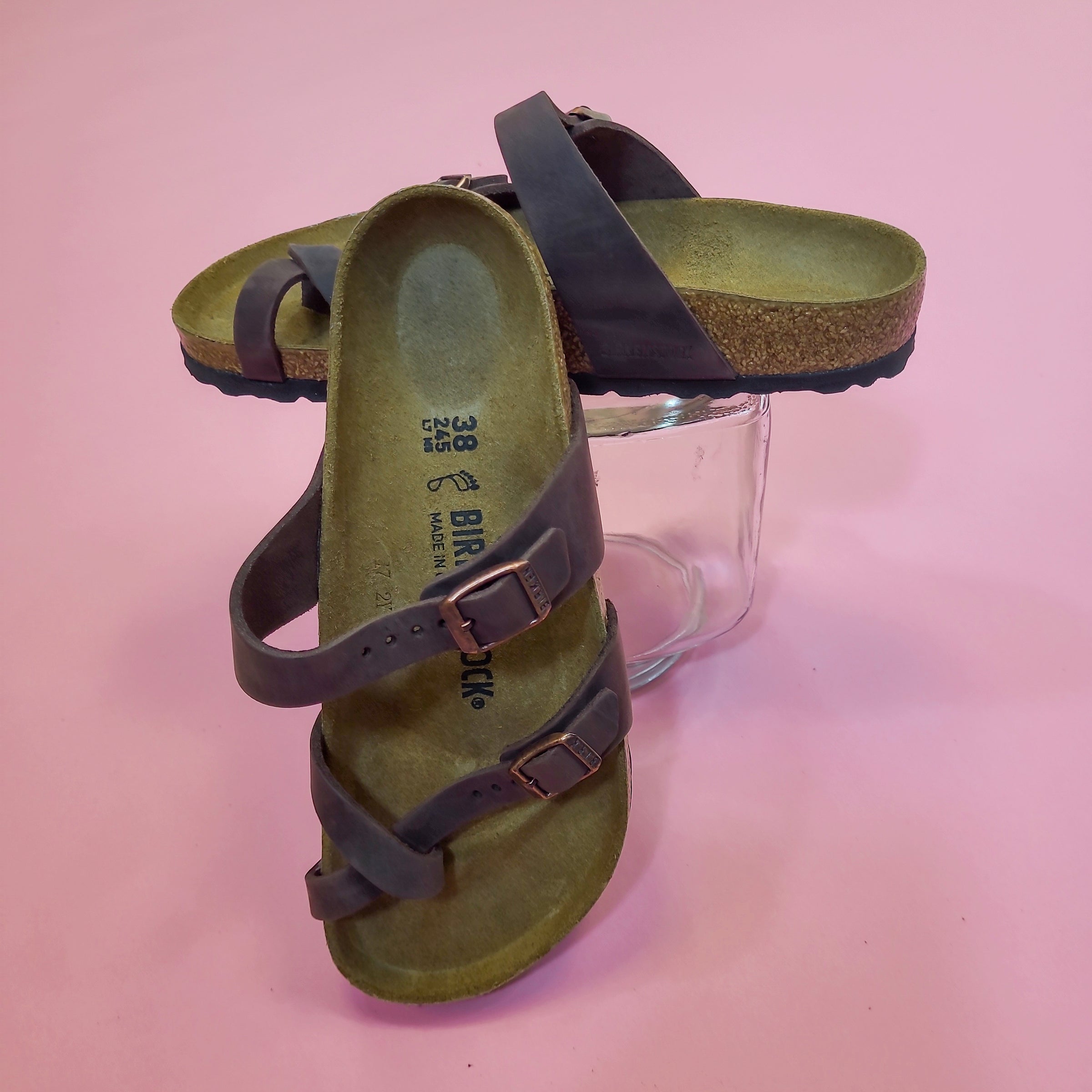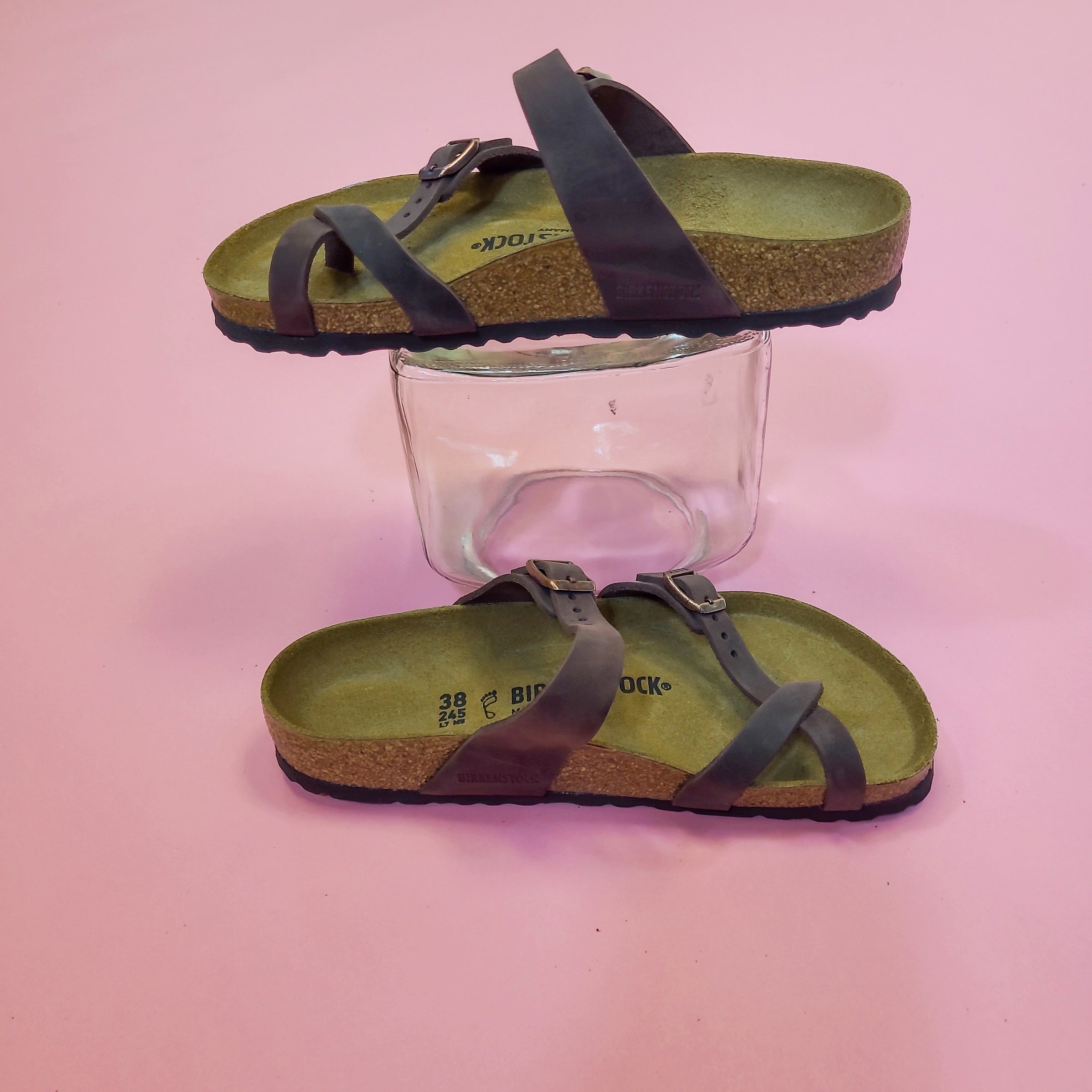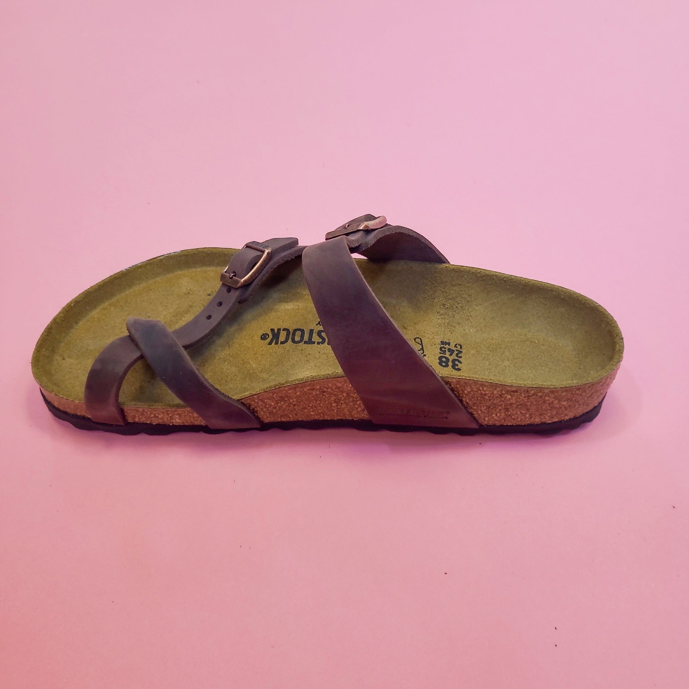 The BIRKENSTOCK Mayari thong sandal is a modern model with a toe loop. The impressive combination of design and wearability will see fashion-conscious men and women through the day with elegance and comfort. The upper is made from extra thick, oiled nubuck leather with an open-selvage finish.