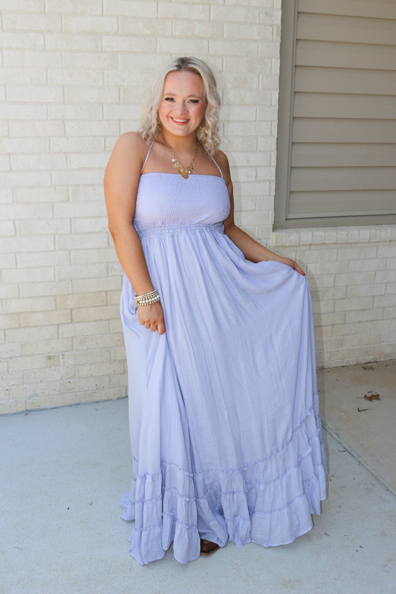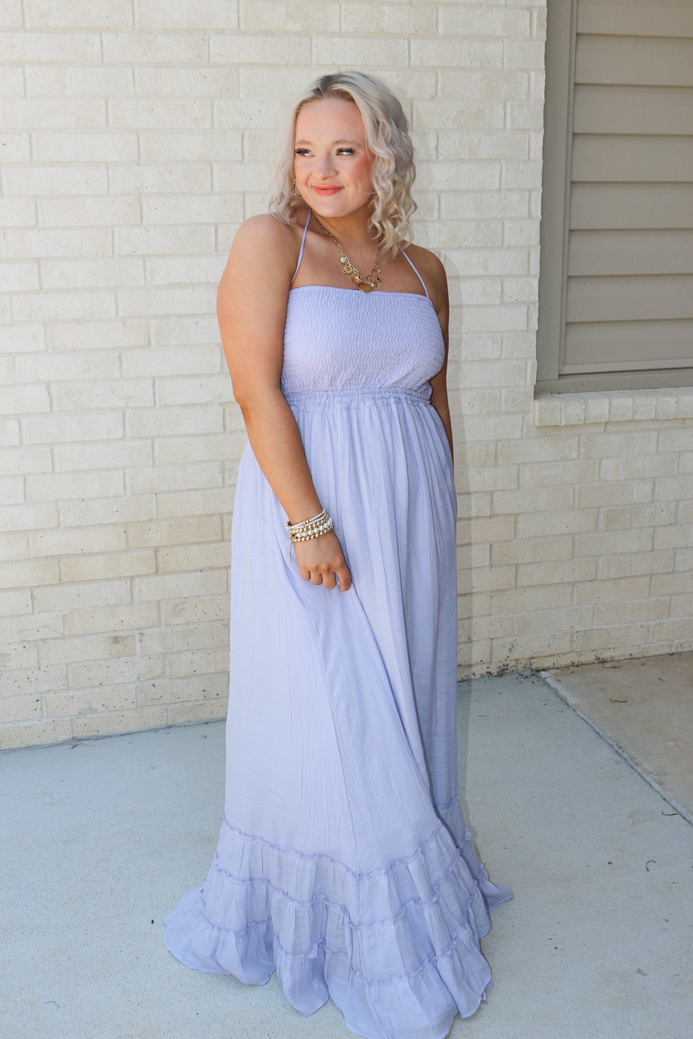 Take your style to the max with this playful lavender maxi dress. Featuring a strapless design and open back, this dress is perfect for any occasion. So why not meet me in the middle and add a touch of fun to your wardrobe?