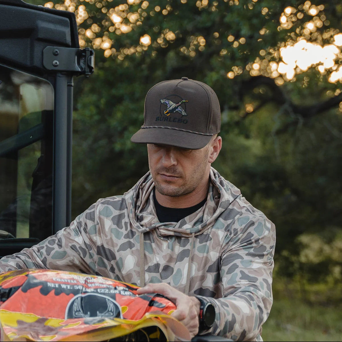 Take flight in style with the Fly By Brown Cap from BURLEBO. Featuring an embroidered mallard in mid-flight, this cap captures the spirit of the outdoors with rugged charm. Set against a deep brown background, the bold artwork is complemented by a black rope detail across the front panel for a classic touch. Built for comfort and durability, this cap is perfect for everyday wear, whether you're in the field, on the water, or just out and about.