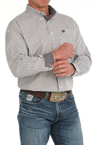 When performance matters, choose a handsome white striped poly/Tencel/cotton twill weave like this one engineered by CINCH. Design features include purple contrast trim, an open left front pocket, an embroidered logo, and white buttons.