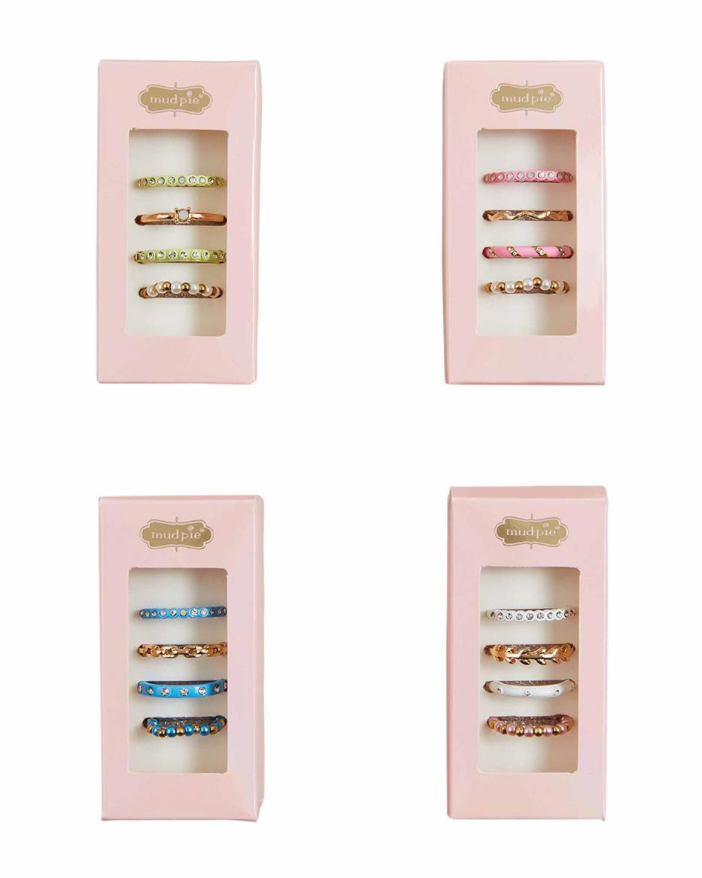 Set of four enamel coated metal stacking rings with pave rhinestone, pearl and beaded details arrive in iridescent gift box in cardstock displayer.