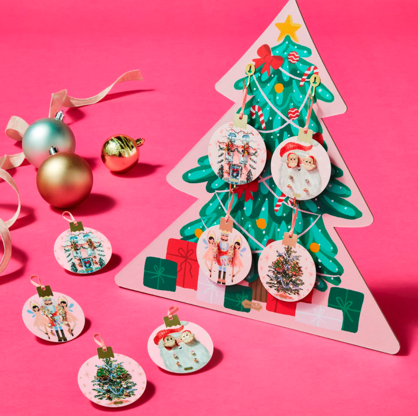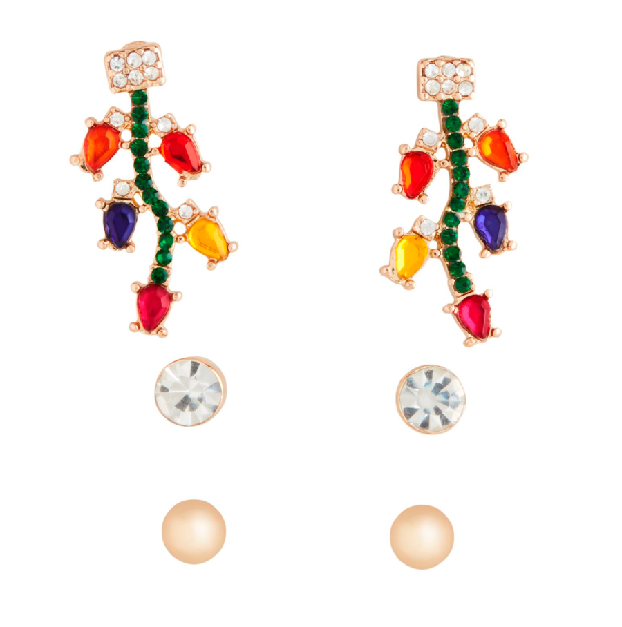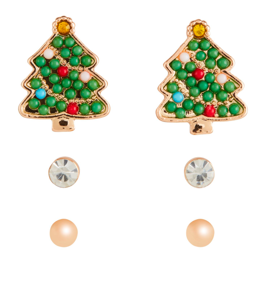 Set of three colored and pave rhinestone stud earrings with hypoallergenic posts. Comes on ornament display card along with large figural cardstock tree displayer.
