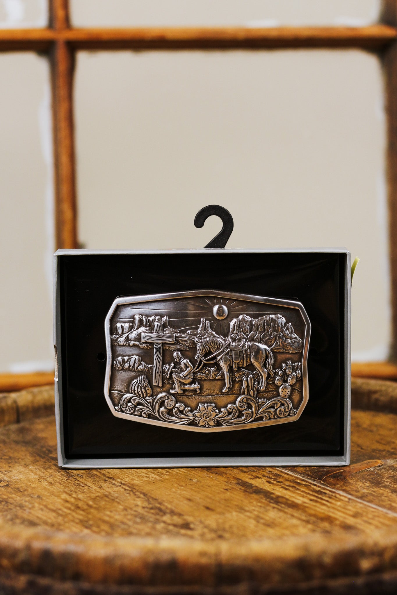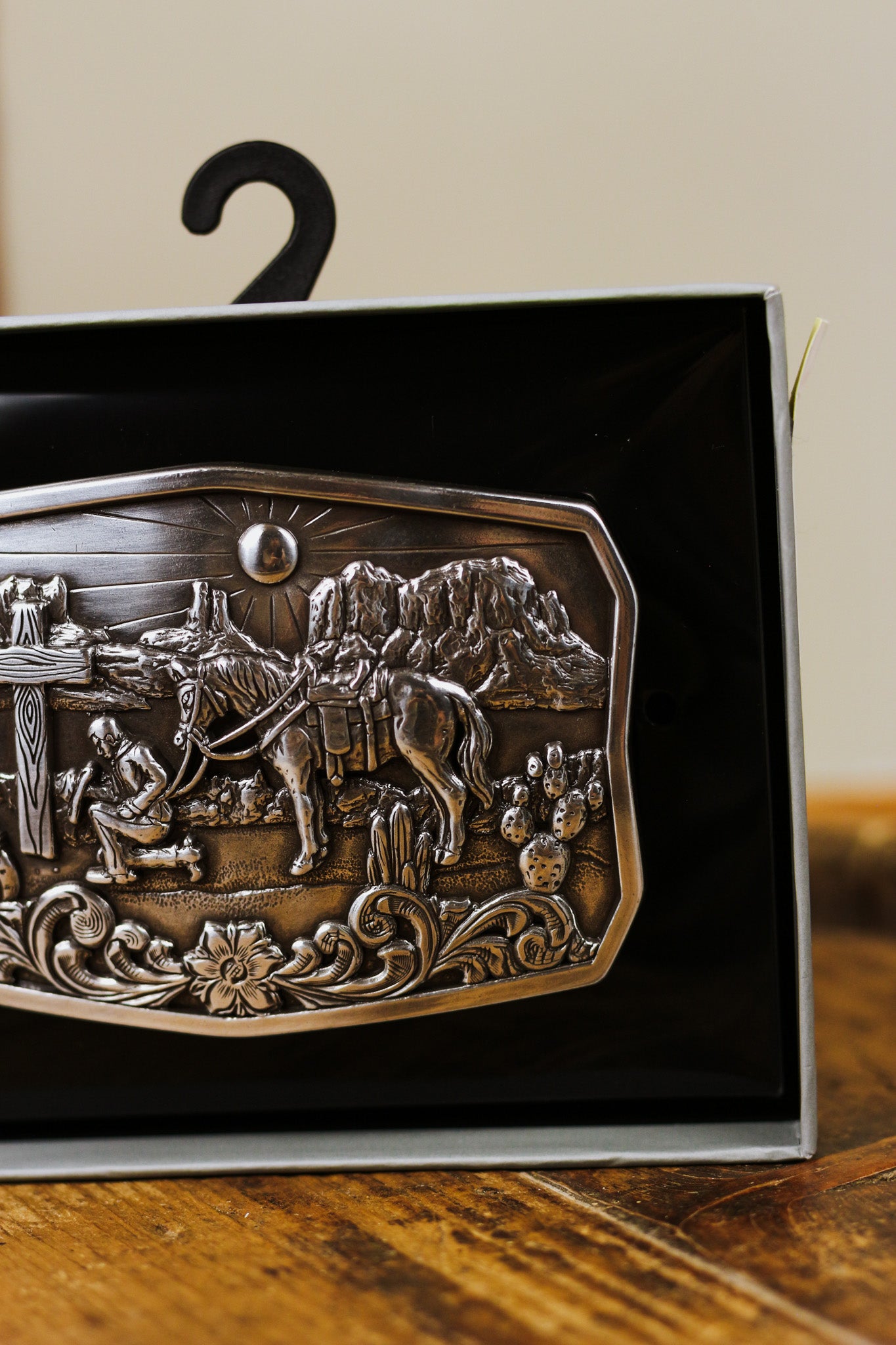 Beautifully designed buckle by M&F Western Products. Rectangle buckle with a cliffs and rocks in the background and a praying cowboy and horse in the foreground. Antique silver finish.