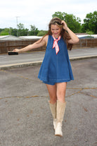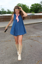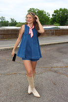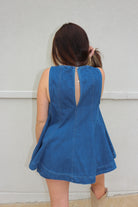 Sleeveless flared A-line denim top in a classic cotton-polyester blend. Pairs perfectly with matching bottoms sold separately. The relaxed silhouette and structured fabric make it an easy layering piece for any season.
