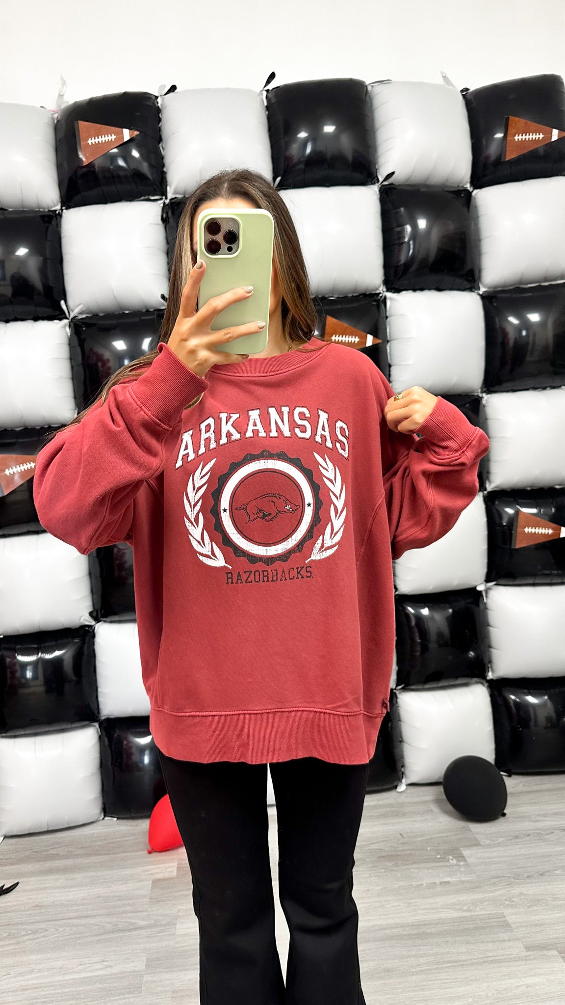 Get ready to stand out in the crowd with this Red Arkansas Razorback Sweatshirt! The vibrant red color will catch everyone's eye, while the soft and cozy material will keep you warm and comfortable. Show off your team spirit with the iconic Razorback logo proudly displayed on the front. Go Hogs!