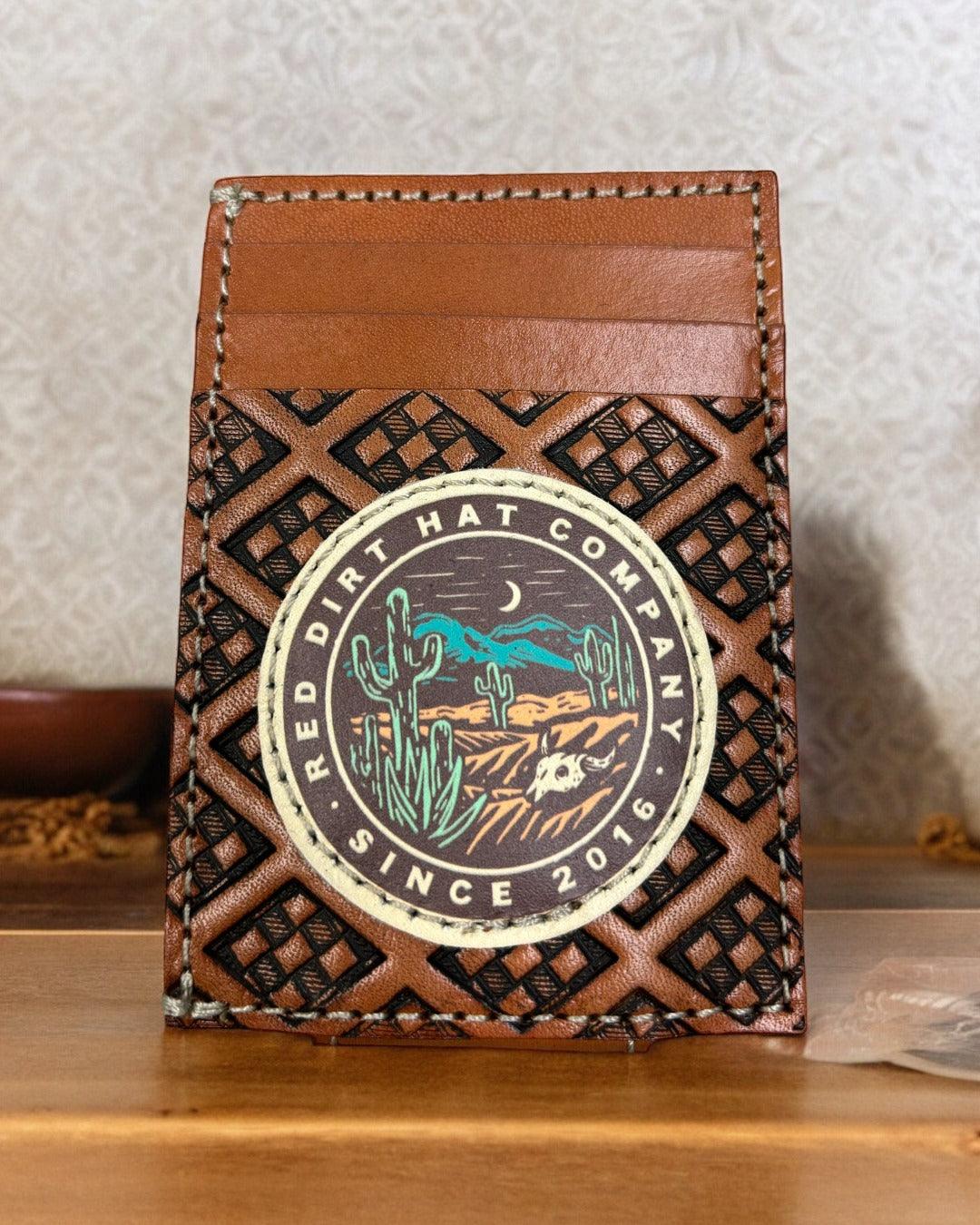 Red Dirt Hat Co tan tooled leather with desert moon scene logo patch card case. Features 3 credit card slots, 1 side slip pocket, and a magnetic currency clip.