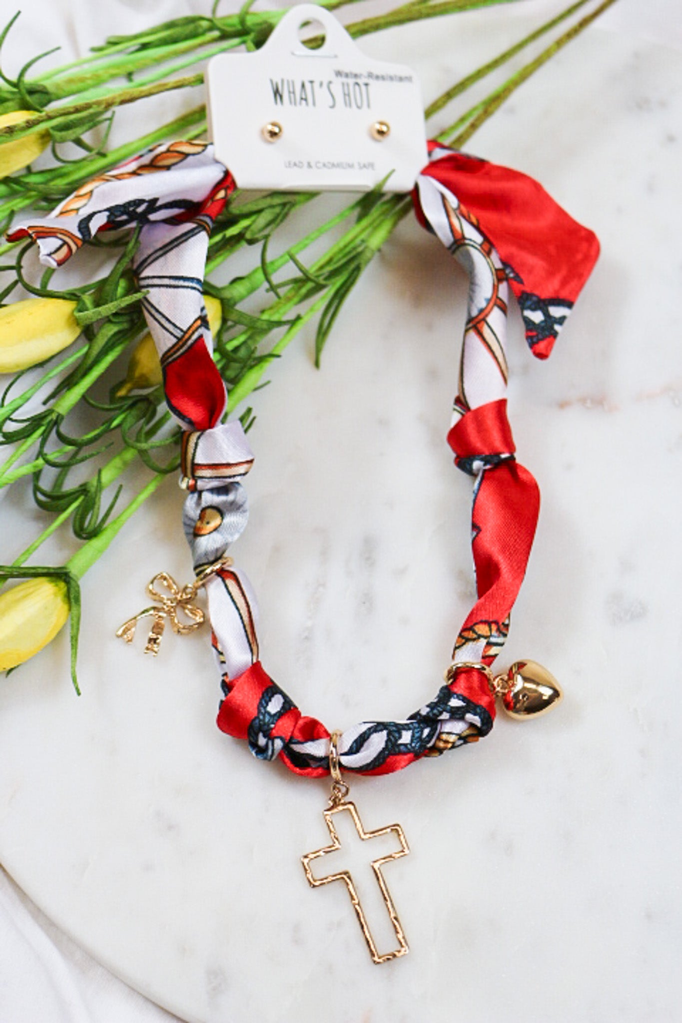 Elevate your style with the Red Gold Knotted Scarf Necklace, a striking accessory that blends vibrant red fabric with elegant gold accents. Its unique knotted design adds a touch of sophistication and flair, perfect for enhancing any outfit. Lightweight and comfortable, this necklace offers a bold statement without sacrificing ease of wear. Make every look unforgettable with this versatile and eye-catching piece.