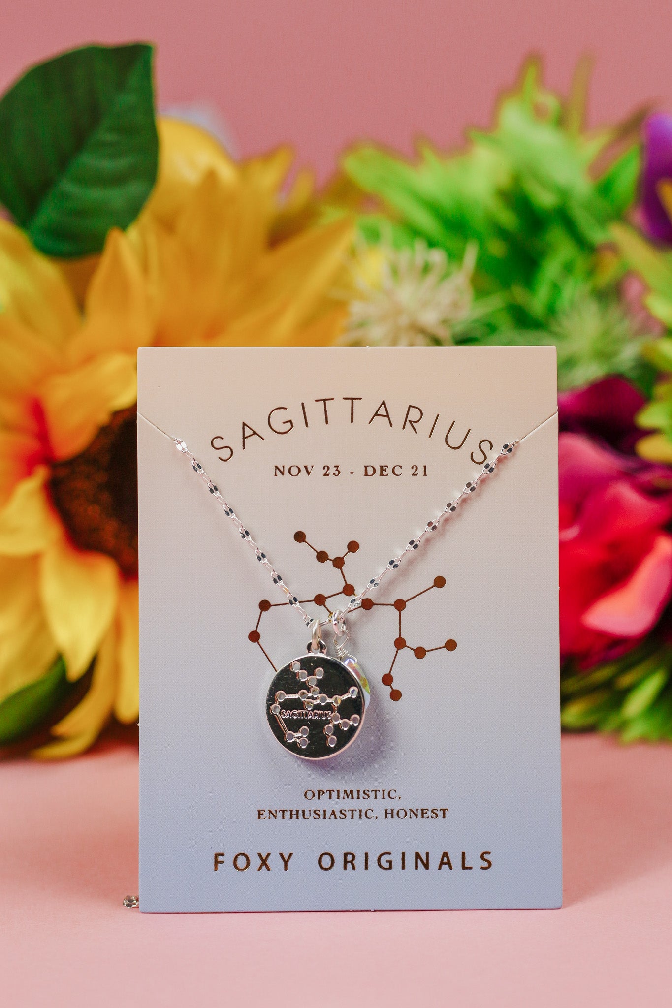 Optimistic. Enthusiastic. Honest. Show off your astrological sign with this celestial necklace featuring a Sagittarius star map pendant paired with an iridescent moonstone charm