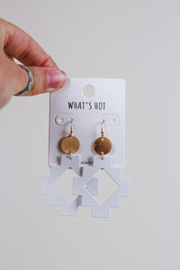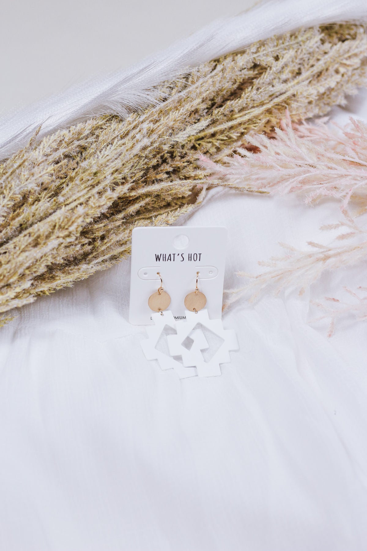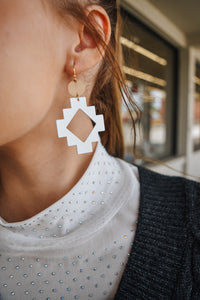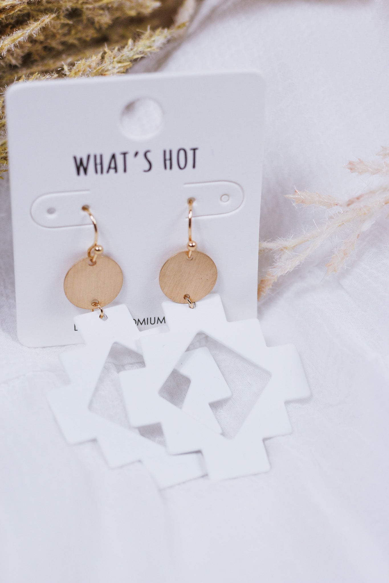 This beautiful 2" earring is crafted with white color coated metal and decorated with an Aztec pattern. It's simple, yet elegant design is sure to be a hit with all who lay eyes upon it.