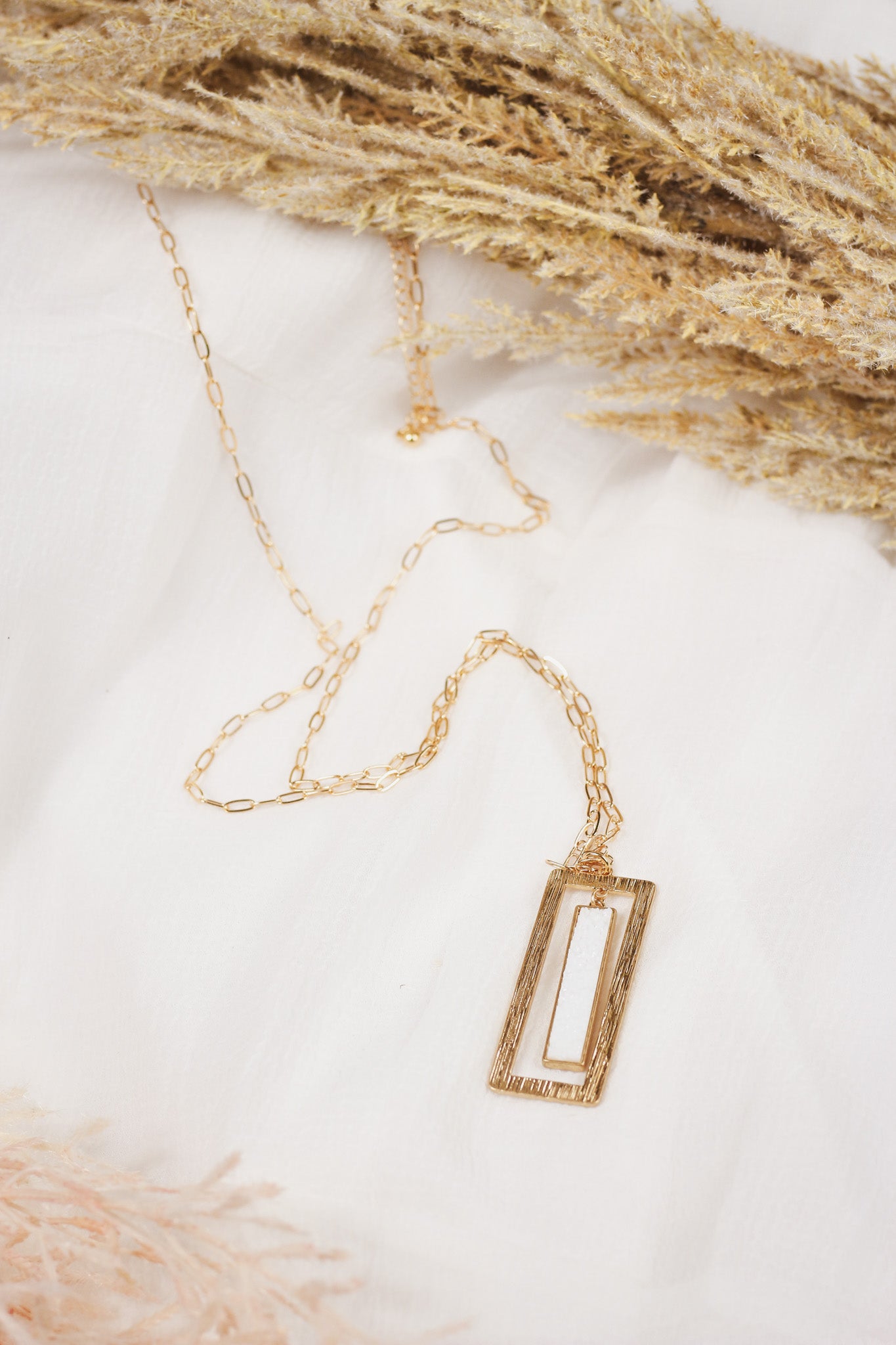 White Druzy and Gold Rectangle Bar 32" Necklace