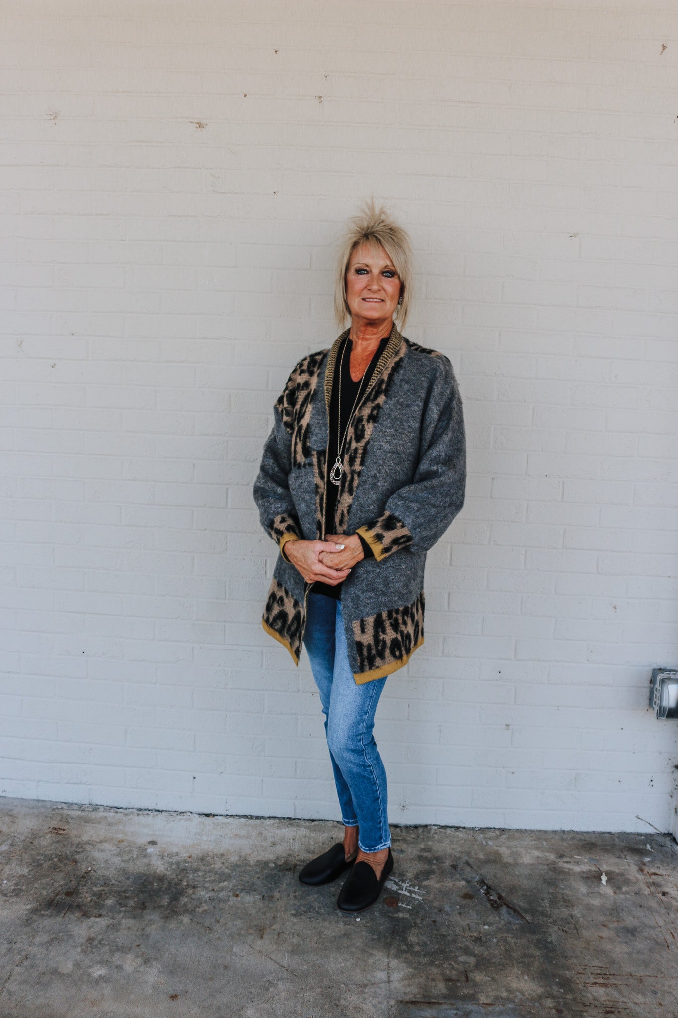 The Wild & Cozy Grey Leopard Cardigan will be your snuggly go-to when the weather turns brisk. So chic, it'll have you purring with delight! Perfect for days when you're feeling wild and comfy. Get yours now and pounce on this stylish look!
