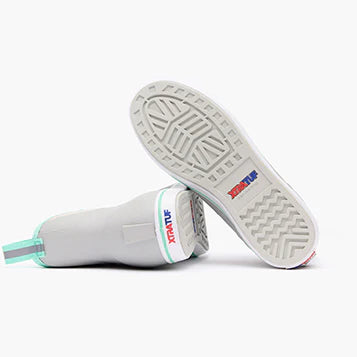 The Ankle Deck Boot collection has been crafted specifically for Off-Shore anglers. Anglers are athletes, and like any athlete they need the best footwear to help them perform at a high level. We've created a lightweight design with the same slip-resistant Chevron outsole found in our Legacy boots. The performance ankle deck boot is the perfect boot for any on the water athlete looking for protection with slip-on-and-go styling. This Light Gray boot features a complementary seafoam detail at the sole, pull-tabs and top lining for added style.