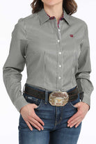 This black-striped poly/Tencel/cotton twill weave is your ideal pick for heading to the arena or into town. Hardworking from sunup to sundown, this shirt features burgundy contrast trim, an open left front pocket with an embroidered logo, and traditional white buttons.