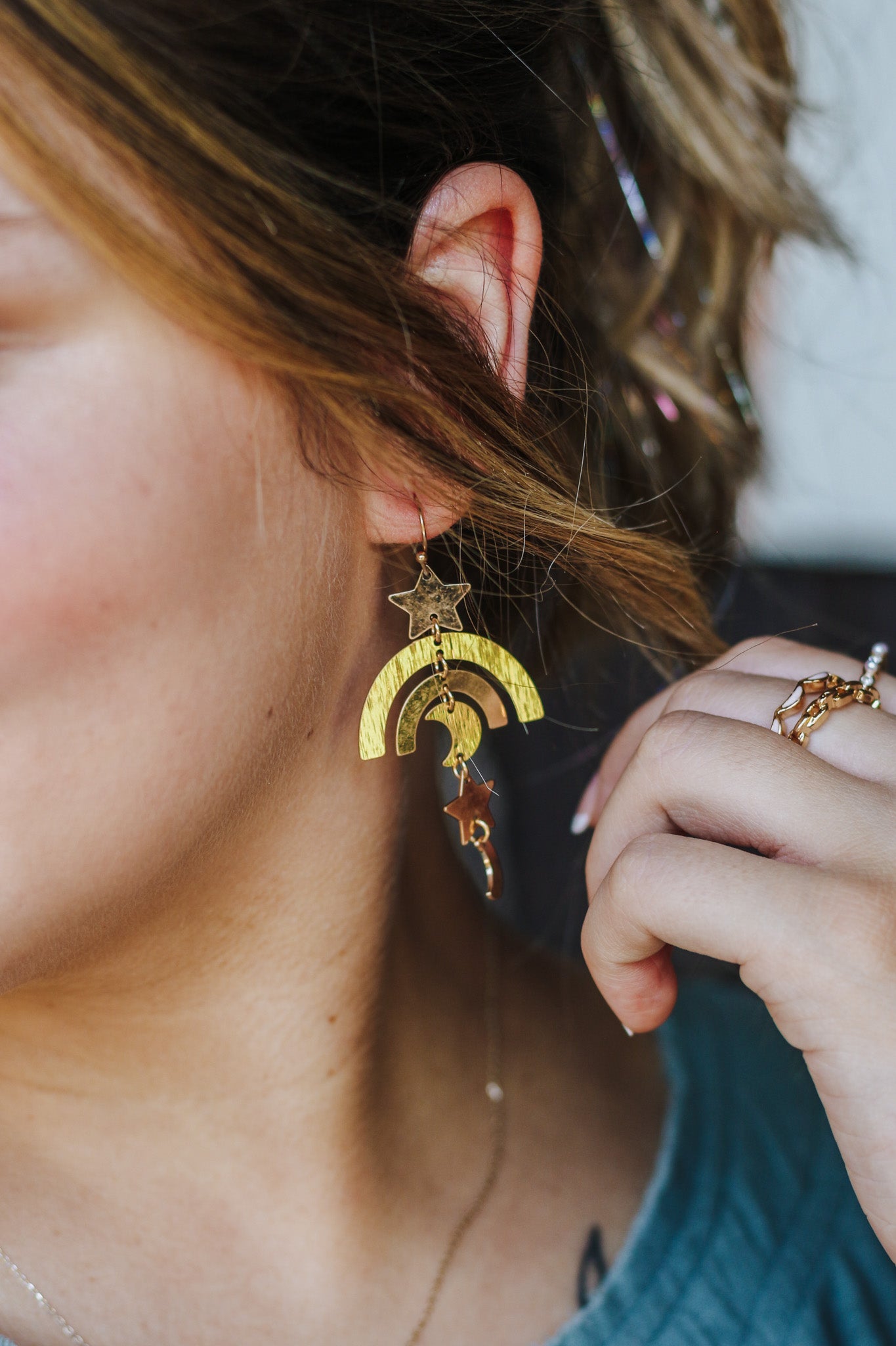 Slip into this one-of-a-kind celestial style and you'll be shooting for the stars! Our Worn Gold and Silver Moon and Star Drop 2" Earring makes an otherworldly statement - combining a unique gold and silver sheen with a classic star and moon design for an accessory that will have you glowing brighter than the night sky.