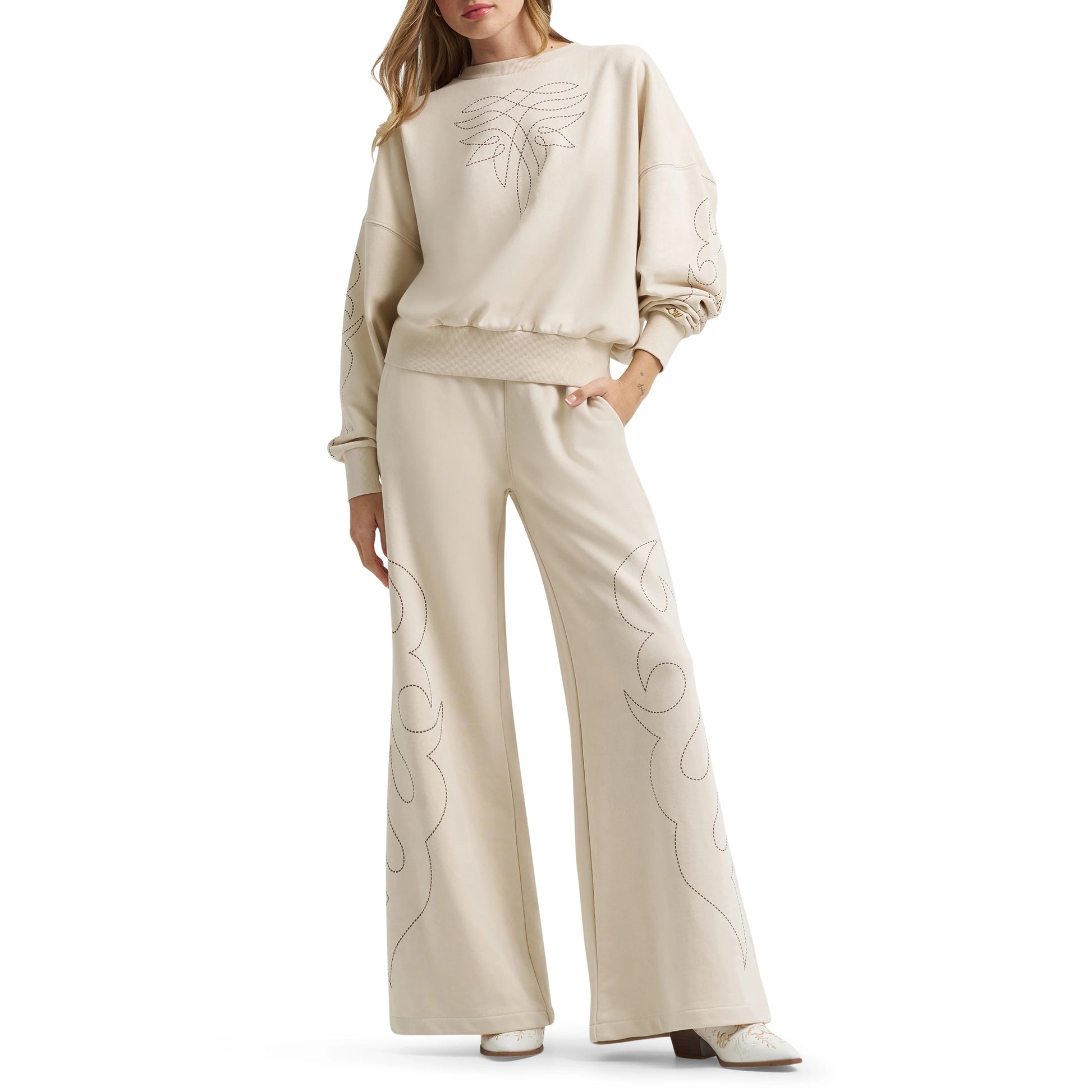 Embrace the spirit of country style with this cream-colored sweatshirt from Wrangler's exclusive Lainey Wilson collection. Crafted from a comfortable cotton-polyester blend, this outerwear piece delivers warmth and durability for everyday wear. Perfect for layering or standing alone, it's an essential addition to any western wardrobe.