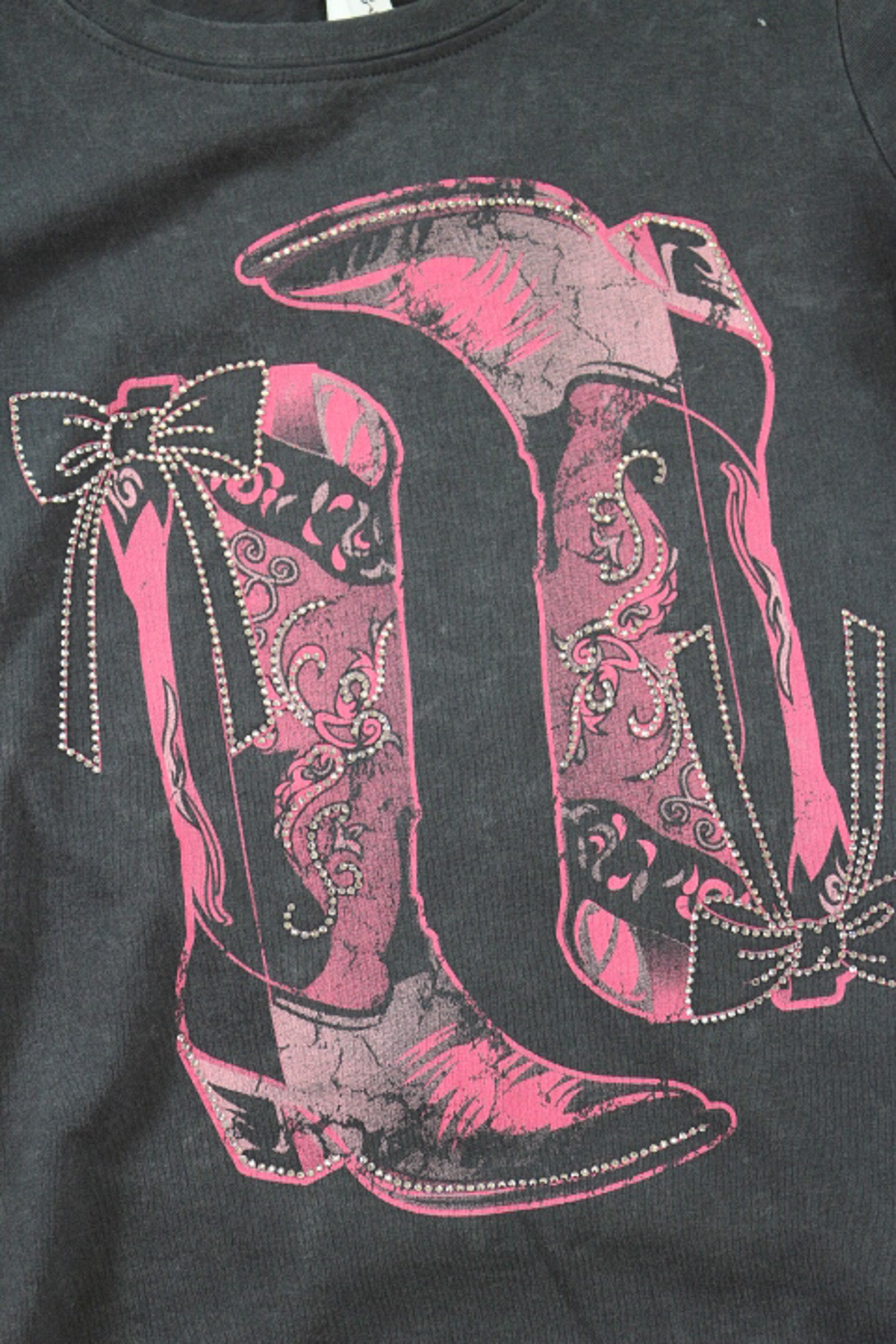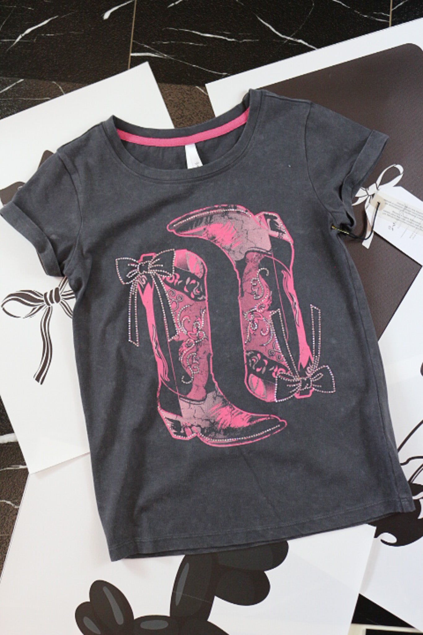 Sparkle with every step in our Youth Girl's Rhinestone Boot Tee! This playful top features a dazzling rhinestone boot design that catches the light and turns heads. Perfect for young fashionistas who love a touch of bling, this comfortable tee pairs easily with jeans, skirts, or shorts.