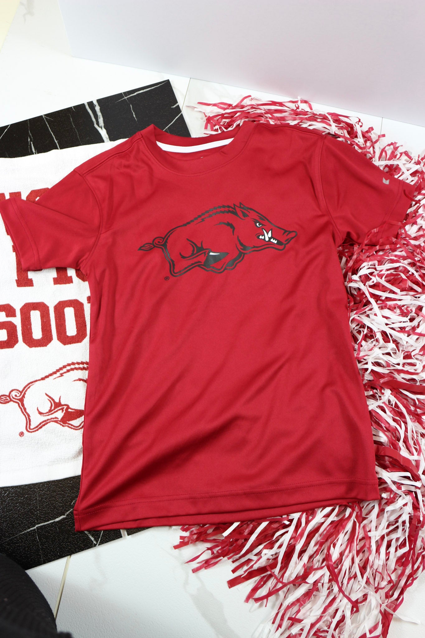 Get ready to rock the red with our Youth Razorback Red Ripple T-Shirt! Made with dry fit material, this tee keeps you cool and comfortable while showing off a bold razorback design on the front. Perfect for young fans of the beloved team. Go Razorbacks!